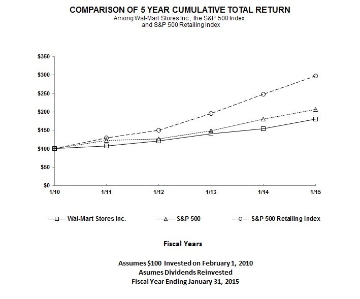 This graph compares the cumulative total shareholder return on Walmart's common stock during the five fiscal years ending with fiscal 2015 to the cumulative total returns on the S&P 500 Retailing Index and the S&P 500 Index. The comparison assumes $100 was invested on February 1, 2010, in shares of our common stock and in each of the indices shown and assumes that all of the dividends were reinvested.