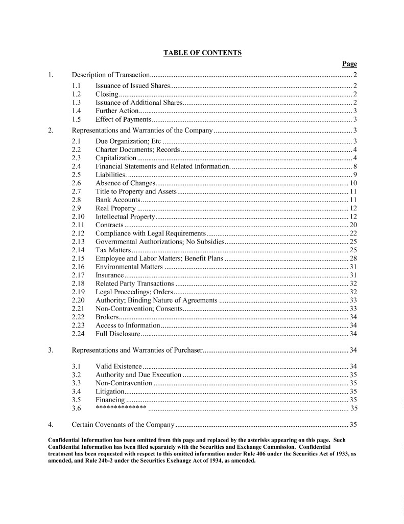 TABLE OF CONTENTS Page 1. Description of Transaction ............................................................................................................... 2 1.1 Issuance of Issued Shares.................................................................................................... 2 1.2 Closing ................................................................................................................................ 2 1.3 Issuance of Additional Shares ............................................................................................. 2 1.4 Further Action ..................................................................................................................... 3 1.5 Effect of Payments .............................................................................................................. 3 2. Representations and Warranties of the Company ............................................................................ 3 2.1 Due Organization; Etc ........................................................................................................ 3 2.2 Charter Documents; Records .............................................................................................. 4 2.3 Capitalization ...................................................................................................................... 4 2.4 Financial Statements and Related Information. .................................................................. 8 2.5 Liabilities. ........................................................................................................................... 9 2.6 Absence of Changes .......................................................................................................... 10 2.7 Title to Property and Assets .............................................................................................. 11 2.8 Bank Accounts .................................................................................................................. 11 2.9 Real Property .................................................................................................................... 12 2.10 Intellectual Property .......................................................................................................... 12 2.11 Contracts ........................................................................................................................... 20 2.12 Compliance with Legal Requirements .............................................................................. 22 2.13 Governmental Authorizations; No Subsidies .................................................................... 25 2.14 Tax Matters ....................................................................................................................... 25 2.15 Employee and Labor Matters; Benefit Plans .................................................................... 28 2.16 Environmental Matters ..................................................................................................... 31 2.17 Insurance ........................................................................................................................... 31 2.18 Related Party Transactions ............................................................................................... 32 2.19 Legal Proceedings; Orders ................................................................................................ 32 2.20 Authority; Binding Nature of Agreements ....................................................................... 33 2.21 Non-Contravention; Consents ........................................................................................... 33 2.22 Brokers .............................................................................................................................. 34 2.23 Access to Information ....................................................................................................... 34 2.24 Full Disclosure .................................................................................................................. 34 3. Representations and Warranties of Purchaser ................................................................................ 34 3.1 Valid Existence ................................................................................................................. 34 3.2 Authority and Due Execution ........................................................................................... 35 3.3 Non-Contravention ........................................................................................................... 35 3.4 Litigation ........................................................................................................................... 35 3.5 Financing .......................................................................................................................... 35 3.6 ************** ............................................................... ............................................... 35 4. Certain Covenants of the Company ............................................................................................... 35 Confidential Information has been omitted from this page and replaced by the asterisks appearing on this page. Such Confidential Information has been filed separately with the Securities and Exchange Commission. Confidential treatment has been requested with respect to this omitted information under Rule 406 under the Securities Act of 1933, as amended, and Rule 24b-2 under the Securities Exchange Act of 1934, as amended.