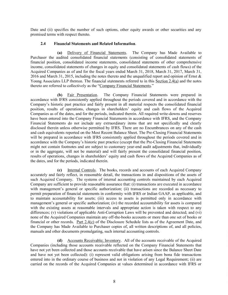 Date and (ii) specifies the number of such options, other equity awards or other securities and any promised terms with respect thereto. 2.4 Financial Statements and Related Information. (a) Delivery of Financial Statements. The Company has Made Available to Purchaser the audited consolidated financial statements (consisting of consolidated statements of financial position, consolidated income statements, consolidated statements of other comprehensive income, consolidated statements of changes in equity and consolidated statements of cash flows) of the Acquired Companies as of and for the fiscal years ended March 31, 2018, March 31, 2017, March 31, 2016 and March 31, 2015, including the notes thereto and the unqualified report and opinion of Ernst & Young Associates LLP thereon. The financial statements referred to in this Section 2.4(a) and the notes thereto are referred to collectively as the “Company Financial Statements.” (b) Fair Presentation. The Company Financial Statements were prepared in accordance with IFRS consistently applied throughout the periods covered and in accordance with the Company’s historic past practice and fairly present in all material respects the consolidated financial position, results of operations, changes in shareholders’ equity and cash flows of the Acquired Companies as of the dates, and for the periods, indicated therein. All required write-downs and reserves have been entered into the Company Financial Statements in accordance with IFRS, and the Company Financial Statements do not include any extraordinary items that are not specifically and clearly disclosed therein unless otherwise permitted by IFRS. There are no Encumbrances on any of the cash and cash equivalents reported on the Most Recent Balance Sheet. The Pre-Closing Financial Statements will be prepared in accordance with IFRS consistently applied throughout the periods covered and in accordance with the Company’s historic past practice (except that the Pre-Closing Financial Statements might not contain footnotes and are subject to customary year-end audit adjustments that, individually or in the aggregate, will not be material) and will fairly present the consolidated financial position, results of operations, changes in shareholders’ equity and cash flows of the Acquired Companies as of the dates, and for the periods, indicated therein. (c) Internal Controls. The books, records and accounts of each Acquired Company accurately and fairly reflect, in reasonable detail, the transactions in and dispositions of the assets of such Acquired Company. The systems of internal accounting controls maintained by each Acquired Company are sufficient to provide reasonable assurance that: (i) transactions are executed in accordance with management’s general or specific authorization; (ii) transactions are recorded as necessary to permit preparation of financial statements in conformity with IFRS or Indian GAAP, as applicable, and to maintain accountability for assets; (iii) access to assets is permitted only in accordance with management’s general or specific authorization; (iv) the recorded accountability for assets is compared with the existing assets at reasonable intervals and appropriate action is taken with respect to any differences; (v) violations of applicable Anti-Corruption Laws will be prevented and detected; and (vi) none of the Acquired Companies maintain any off-the-books accounts or more than one set of books or financial or other records. Part 2.4(c) of the Disclosure Schedule lists as of the Agreement Date, and the Company has Made Available to Purchaser copies of, all written descriptions of, and all policies, manuals and other documents promulgating, such internal accounting controls. (d) Accounts Receivable; Inventory. All of the accounts receivable of the Acquired Companies (including those accounts receivable reflected on the Company Financial Statements that have not yet been collected and those accounts receivable that have arisen since the Balance Sheet Date and have not yet been collected): (i) represent valid obligations arising from bona fide transactions entered into in the ordinary course of business and not in violation of any Legal Requirement; (ii) are carried on the records of the Acquired Companies at values determined in accordance with IFRS or 8
