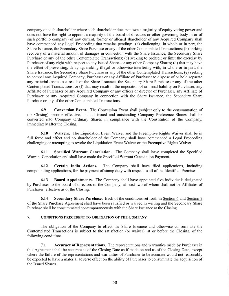 company of such shareholder where such shareholder does not own a majority of equity voting power and does not have the right to appoint a majority of the board of directors or other governing body in or of such portfolio company) of any current, former or alleged shareholder of any Acquired Company shall have commenced any Legal Proceeding that remains pending: (a) challenging, in whole or in part, the Share Issuance, the Secondary Share Purchase or any of the other Contemplated Transactions; (b) seeking recovery of a material amount of damages in connection with the Share Issuance, the Secondary Share Purchase or any of the other Contemplated Transactions; (c) seeking to prohibit or limit the exercise by Purchaser of any right with respect to any Issued Shares or any other Company Shares; (d) that may have the effect of preventing, delaying, making illegal or otherwise interfering with, in whole or in part, the Share Issuance, the Secondary Share Purchase or any of the other Contemplated Transactions; (e) seeking to compel any Acquired Company, Purchaser or any Affiliate of Purchaser to dispose of or hold separate any material assets as a result of the Share Issuance, the Secondary Share Purchase or any of the other Contemplated Transactions; or (f) that may result in the imposition of criminal liability on Purchaser, any Affiliate of Purchaser or any Acquired Company or any officer or director of Purchaser, any Affiliate of Purchaser or any Acquired Company in connection with the Share Issuance, the Secondary Share Purchase or any of the other Contemplated Transactions. 6.9 Conversion Event. The Conversion Event shall (subject only to the consummation of the Closing) become effective, and all issued and outstanding Company Preference Shares shall be converted into Company Ordinary Shares in compliance with the Constitution of the Company, immediately after the Closing. 6.10 Waivers. The Liquidation Event Waiver and the Preemptive Rights Waiver shall be in full force and effect and no shareholder of the Company shall have commenced a Legal Proceeding challenging or attempting to revoke the Liquidation Event Waiver or the Preemptive Rights Waiver. 6.11 Specified Warrant Cancelation. The Company shall have completed the Specified Warrant Cancelation and shall have made the Specified Warrant Cancelation Payment. 6.12 Certain India Actions. The Company shall have filed applications, including compounding applications, for the payment of stamp duty with respect to all of the Identified Premises. 6.13 Board Appointments. The Company shall have appointed five individuals designated by Purchaser to the board of directors of the Company, at least two of whom shall not be Affiliates of Purchaser, effective as of the Closing. 6.14 Secondary Share Purchase. Each of the conditions set forth in Section 6 and Section 7 of the Share Purchase Agreement shall have been satisfied or waived in writing and the Secondary Share Purchase shall be consummated contemporaneously with the Share Issuance at the Closing. 7. CONDITIONS PRECEDENT TO OBLIGATION OF THE COMPANY The obligation of the Company to effect the Share Issuance and otherwise consummate the Contemplated Transactions is subject to the satisfaction (or waiver), at or before the Closing, of the following conditions: 7.1 Accuracy of Representations. The representations and warranties made by Purchaser in this Agreement shall be accurate as of the Closing Date as if made on and as of the Closing Date, except where the failure of the representations and warranties of Purchaser to be accurate would not reasonably be expected to have a material adverse effect on the ability of Purchaser to consummate the acquisition of the Issued Shares. 50