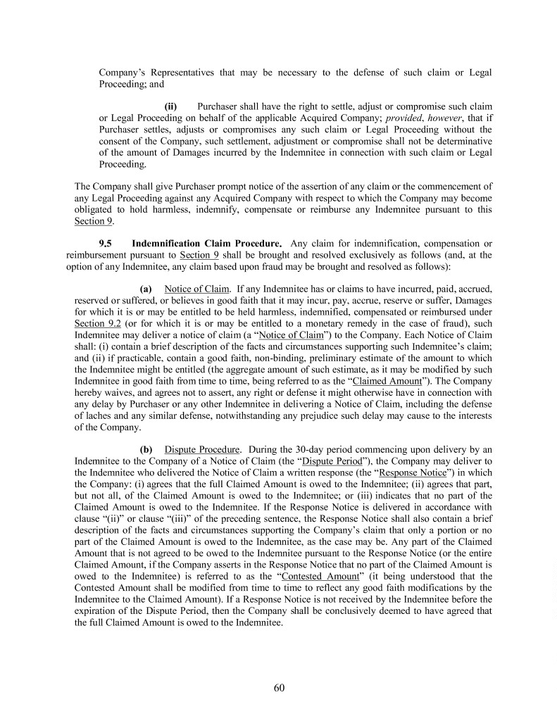 Company’s Representatives that may be necessary to the defense of such claim or Legal Proceeding; and (ii) Purchaser shall have the right to settle, adjust or compromise such claim or Legal Proceeding on behalf of the applicable Acquired Company; provided, however, that if Purchaser settles, adjusts or compromises any such claim or Legal Proceeding without the consent of the Company, such settlement, adjustment or compromise shall not be determinative of the amount of Damages incurred by the Indemnitee in connection with such claim or Legal Proceeding. The Company shall give Purchaser prompt notice of the assertion of any claim or the commencement of any Legal Proceeding against any Acquired Company with respect to which the Company may become obligated to hold harmless, indemnify, compensate or reimburse any Indemnitee pursuant to this Section 9. 9.5 Indemnification Claim Procedure. Any claim for indemnification, compensation or reimbursement pursuant to Section 9 shall be brought and resolved exclusively as follows (and, at the option of any Indemnitee, any claim based upon fraud may be brought and resolved as follows): (a) Notice of Claim. If any Indemnitee has or claims to have incurred, paid, accrued, reserved or suffered, or believes in good faith that it may incur, pay, accrue, reserve or suffer, Damages for which it is or may be entitled to be held harmless, indemnified, compensated or reimbursed under Section 9.2 (or for which it is or may be entitled to a monetary remedy in the case of fraud), such Indemnitee may deliver a notice of claim (a “Notice of Claim”) to the Company. Each Notice of Claim shall: (i) contain a brief description of the facts and circumstances supporting such Indemnitee’s claim; and (ii) if practicable, contain a good faith, non-binding, preliminary estimate of the amount to which the Indemnitee might be entitled (the aggregate amount of such estimate, as it may be modified by such Indemnitee in good faith from time to time, being referred to as the “Claimed Amount”). The Company hereby waives, and agrees not to assert, any right or defense it might otherwise have in connection with any delay by Purchaser or any other Indemnitee in delivering a Notice of Claim, including the defense of laches and any similar defense, notwithstanding any prejudice such delay may cause to the interests of the Company. (b) Dispute Procedure. During the 30-day period commencing upon delivery by an Indemnitee to the Company of a Notice of Claim (the “Dispute Period”), the Company may deliver to the Indemnitee who delivered the Notice of Claim a written response (the “Response Notice”) in which the Company: (i) agrees that the full Claimed Amount is owed to the Indemnitee; (ii) agrees that part, but not all, of the Claimed Amount is owed to the Indemnitee; or (iii) indicates that no part of the Claimed Amount is owed to the Indemnitee. If the Response Notice is delivered in accordance with clause “(ii)” or clause “(iii)” of the preceding sentence, the Response Notice shall also contain a brief description of the facts and circumstances supporting the Company’s claim that only a portion or no part of the Claimed Amount is owed to the Indemnitee, as the case may be. Any part of the Claimed Amount that is not agreed to be owed to the Indemnitee pursuant to the Response Notice (or the entire Claimed Amount, if the Company asserts in the Response Notice that no part of the Claimed Amount is owed to the Indemnitee) is referred to as the “Contested Amount” (it being understood that the Contested Amount shall be modified from time to time to reflect any good faith modifications by the Indemnitee to the Claimed Amount). If a Response Notice is not received by the Indemnitee before the expiration of the Dispute Period, then the Company shall be conclusively deemed to have agreed that the full Claimed Amount is owed to the Indemnitee. 60