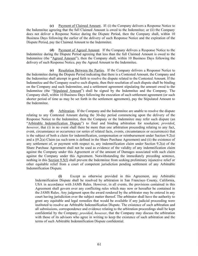 (c) Payment of Claimed Amount. If: (i) the Company delivers a Response Notice to the Indemnitee agreeing that the full Claimed Amount is owed to the Indemnitee; or (ii) the Company does not deliver a Response Notice during the Dispute Period, then the Company shall, within 10 Business Days following the earlier of the delivery of such Response Notice and the expiration of the Dispute Period, pay the Claimed Amount to the Indemnitee. (d) Payment of Agreed Amount. If the Company delivers a Response Notice to the Indemnitee during the Dispute Period agreeing that less than the full Claimed Amount is owed to the Indemnitee (the “Agreed Amount”), then the Company shall, within 10 Business Days following the delivery of such Response Notice, pay the Agreed Amount to the Indemnitee. (e) Resolution Between the Parties. If the Company delivers a Response Notice to the Indemnitee during the Dispute Period indicating that there is a Contested Amount, the Company and the Indemnitee shall attempt in good faith to resolve the dispute related to the Contested Amount. If the Indemnitee and the Company resolve such dispute, then their resolution of such dispute shall be binding on the Company and such Indemnitee, and a settlement agreement stipulating the amount owed to the Indemnitee (the “Stipulated Amount”) shall be signed by the Indemnitee and the Company. The Company shall, within 10 Business Days following the execution of such settlement agreement (or such shorter period of time as may be set forth in the settlement agreement), pay the Stipulated Amount to the Indemnitee. (f) Arbitration. If the Company and the Indemnitee are unable to resolve the dispute relating to any Contested Amount during the 30-day period commencing upon the delivery of the Response Notice to the Indemnitee, then the Company or the Indemnitee may refer such dispute (an “Arbitrable Indemnification Dispute”) to final and binding arbitration for resolution; provided, however, that (i) in no event shall there be more than one arbitration proceeding relating to any fact, event, circumstance or occurrence (or series of related facts, events, circumstances or occurrences) that is the subject of both a claim for indemnification, compensation or reimbursement under Section 9.2(a) and a §9.2(a) Claim (as such term is defined in the Share Purchase Agreement) and (ii) the existence of any settlement of, or payment with respect to, any indemnification claim under Section 9.2(a) of the Share Purchase Agreement shall not be used as evidence of the validity of any indemnification claim against the Company under this Agreement or of the amount of Damages associated with such claim against the Company under this Agreement. Notwithstanding the immediately preceding sentence, nothing in this Section 9.5(f) shall prevent the Indemnitee from seeking preliminary injunctive relief or other equitable relief from a court of competent jurisdiction pending settlement of any Arbitrable Indemnification Dispute. (i) Except as otherwise provided in this Agreement, any Arbitrable Indemnification Dispute shall be resolved by arbitration in San Francisco County, California, USA in accordance with JAMS Rules. However, in all events, the provisions contained in this Agreement shall govern over any conflicting rules which may now or hereafter be contained in the JAMS Rules. Any judgment upon the award rendered by the arbitrator may be entered in any court having jurisdiction over the subject matter thereof. The arbitrator shall have the authority to grant any equitable and legal remedies that would be available if any judicial proceeding were instituted to resolve an Arbitrable Indemnification Dispute. The existence of such arbitration and all submissions, correspondence and evidence relating to the arbitration proceedings shall be kept confidential by the Company; provided, however, that the Company may discuss the arbitration with those of its advisors who agree in writing to keep the existence of such arbitration and the terms of such Arbitrable Indemnification Dispute confidential. 61