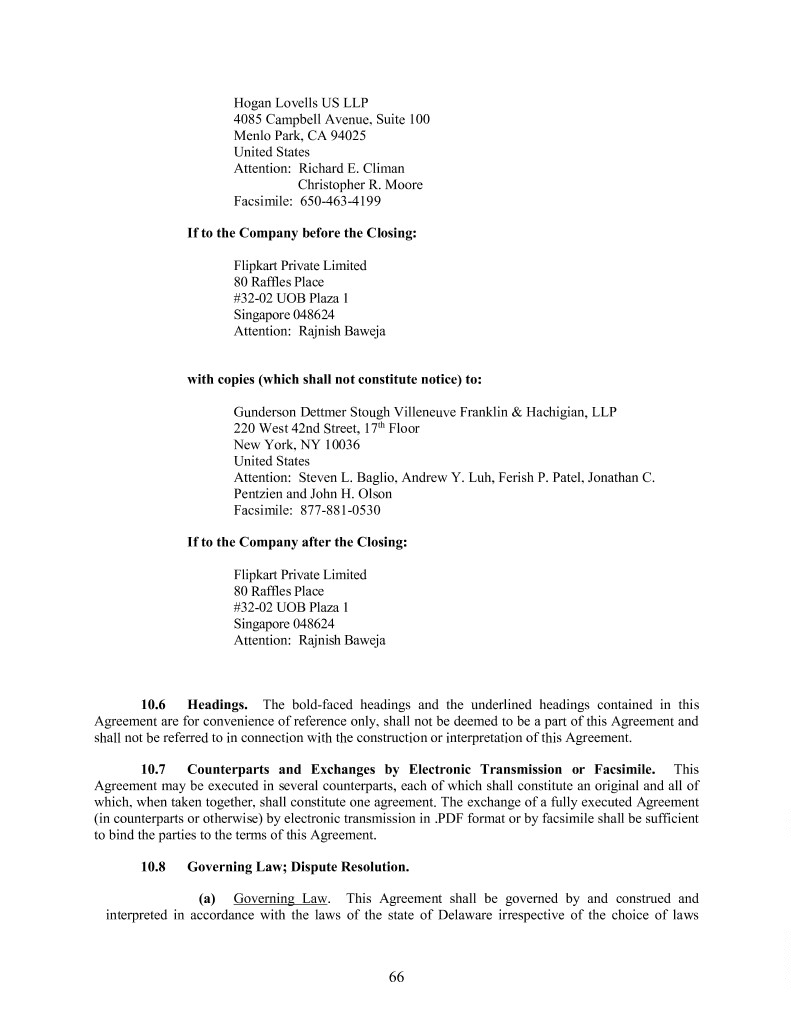 Hogan Lovells US LLP 4085 Campbell Avenue, Suite 100 Menlo Park, CA 94025 United States Attention: Richard E. Climan Christopher R. Moore Facsimile: 650-463-4199 If to the Company before the Closing: Flipkart Private Limited 80 Raffles Place #32-02 UOB Plaza 1 Singapore 048624 Attention: Rajnish Baweja with copies (which shall not constitute notice) to: Gunderson Dettmer Stough Villeneuve Franklin & Hachigian, LLP 220 West 42nd Street, 17th Floor New York, NY 10036 United States Attention: Steven L. Baglio, Andrew Y. Luh, Ferish P. Patel, Jonathan C. Pentzien and John H. Olson Facsimile: 877-881-0530 If to the Company after the Closing: Flipkart Private Limited 80 Raffles Place #32-02 UOB Plaza 1 Singapore 048624 Attention: Rajnish Baweja 10.6 Headings. The bold-faced headings and the underlined headings contained in this Agreement are for convenience of reference only, shall not be deemed to be a part of this Agreement and shall not be referred to in connection with the construction or interpretation of this Agreement. 10.7 Counterparts and Exchanges by Electronic Transmission or Facsimile. This Agreement may be executed in several counterparts, each of which shall constitute an original and all of which, when taken together, shall constitute one agreement. The exchange of a fully executed Agreement (in counterparts or otherwise) by electronic transmission in .PDF format or by facsimile shall be sufficient to bind the parties to the terms of this Agreement. 10.8 Governing Law; Dispute Resolution. (a) Governing Law. This Agreement shall be governed by and construed and interpreted in accordance with the laws of the state of Delaware irrespective of the choice of laws 66