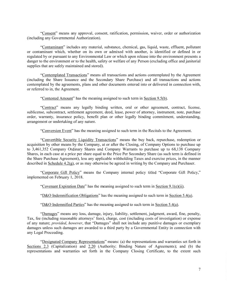 “Consent” means any approval, consent, ratification, permission, waiver, order or authorization (including any Governmental Authorization). “Contaminant” includes any material, substance, chemical, gas, liquid, waste, effluent, pollutant or contaminant which, whether on its own or admixed with another, is identified or defined in or regulated by or pursuant to any Environmental Law or which upon release into the environment presents a danger to the environment or to the health, safety or welfare of any Person (excluding office and janitorial supplies that are safely maintained and stored). “Contemplated Transactions” means all transactions and actions contemplated by the Agreement (including the Share Issuance and the Secondary Share Purchase) and all transactions and actions contemplated by the agreements, plans and other documents entered into or delivered in connection with, or referred to in, the Agreement. “Contested Amount” has the meaning assigned to such term in Section 9.5(b). “Contract” means any legally binding written, oral or other agreement, contract, license, sublicense, subcontract, settlement agreement, deed, lease, power of attorney, instrument, note, purchase order, warranty, insurance policy, benefit plan or other legally binding commitment, understanding, arrangement or undertaking of any nature. “Conversion Event” has the meaning assigned to such term in the Recitals to the Agreement. “Convertible Security Liquidity Transactions” means the buy back, repurchase, redemption or acquisition by other means by the Company, at or after the Closing, of Company Options to purchase up to 3,461,352 Company Ordinary Shares and Company Warrants to purchase up to 68,138 Company Shares, in each case at a price per share equal to the Price Per Secondary Share (as such term is defined in the Share Purchase Agreement), less any applicable withholding Taxes and exercise prices, in the manner described in Schedule 4.2(g), or as may otherwise be agreed in writing by the Company and Purchaser. “Corporate Gift Policy” means the Company internal policy titled “Corporate Gift Policy,” implemented on February 1, 2018. “Covenant Expiration Date” has the meaning assigned to such term in Section 9.1(e)(ii). “D&O Indemnification Obligations” has the meaning assigned to such term in Section 5.4(a). “D&O Indemnified Parties” has the meaning assigned to such term in Section 5.4(a). “Damages” means any loss, damage, injury, liability, settlement, judgment, award, fine, penalty, Tax, fee (including reasonable attorneys’ fees), charge, cost (including costs of investigation) or expense of any nature; provided, however, that “Damages” shall not include any punitive damages or exemplary damages unless such damages are awarded to a third party by a Governmental Entity in connection with any Legal Proceeding. “Designated Company Representations” means: (a) the representations and warranties set forth in Sections 2.3 (Capitalization) and 2.20 (Authority; Binding Nature of Agreements); and (b) the representations and warranties set forth in the Company Closing Certificate, to the extent such 7