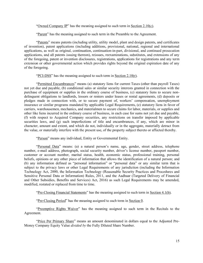 “Owned Company IP” has the meaning assigned to such term in Section 2.10(c). “Parent” has the meaning assigned to such term in the Preamble to the Agreement. “Patents” means patents (including utility, utility model, plant and design patents, and certificates of invention), patent applications (including additions, provisional, national, regional and international applications, as well as original, continuation, continuation-in-part, divisional, and continued prosecution applications, and all patents issuing thereon), reissues, reexaminations, substitutes, and extensions of any of the foregoing, patent or invention disclosures, registrations, applications for registrations and any term extension or other governmental action which provides rights beyond the original expiration date of any of the foregoing. “PCI-DSS” has the meaning assigned to such term in Section 2.10(r). “Permitted Encumbrances” means (a) statutory liens for current Taxes (other than payroll Taxes) not yet due and payable, (b) conditional sales or similar security interests granted in connection with the purchase of equipment or supplies in the ordinary course of business, (c) statutory liens to secure non- delinquent obligations to landlords, lessors or renters under leases or rental agreements, (d) deposits or pledges made in connection with, or to secure payment of, workers’ compensation, unemployment insurance or similar programs mandated by applicable Legal Requirements, (e) statutory liens in favor of carriers, warehousemen, mechanics, and materialmen to secure claims for labor, materials, or supplies and other like liens incurred in the ordinary course of business, in each case for sums not yet due and payable, (f) with respect to Acquired Company securities, any restrictions on transfer imposed by applicable securities laws, and (g) such imperfections of title and encumbrances, if any, which are minor in character, amount and extent, and which do not, individually or in the aggregate, materially detract from the value, or materially interfere with the present use, of the property subject thereto or affected thereby. “Person” means any individual, Entity or Governmental Entity. “Personal Data” means: (a) a natural person’s name, age, gender, street address, telephone number, e-mail address, photograph, social security number, driver’s license number, passport number, customer or account number, marital status, health, economic status, professional training, personal beliefs, opinions or any other piece of information that allows the identification of a natural person; and (b) any information defined as “personal information” or “personal data” or any similar term that is subject to the privacy laws or other Legal Requirements of any jurisdiction (including the Information Technology Act, 2000, the Information Technology (Reasonable Security Practices and Procedures and Sensitive Personal Data or Information) Rules, 2011, and the Aadhaar (Targeted Delivery of Financial and Other Subsidies, Benefits and Services) Act, 2016) as such Legal Requirements may be amended, modified, restated or replaced from time to time. “Pre-Closing Financial Statements” has the meaning assigned to such term in Section 4.1(b). “Pre-Closing Period” has the meaning assigned to such term in Section 0. “Preemptive Rights Waiver” has the meaning assigned to such term in the Recitals to the Agreement. “Price Per Primary Share” means an amount denominated in dollars equal to the Adjusted Pre- Money Company Equity Value divided by the Fully Diluted Share Number. 15