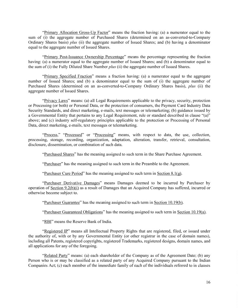 “Primary Allocation Gross-Up Factor” means the fraction having: (a) a numerator equal to the sum of (i) the aggregate number of Purchased Shares (determined on an as-converted-to-Company Ordinary Shares basis) plus (ii) the aggregate number of Issued Shares; and (b) having a denominator equal to the aggregate number of Issued Shares. “Primary Post-Issuance Ownership Percentage” means the percentage representing the fraction having: (a) a numerator equal to the aggregate number of Issued Shares; and (b) a denominator equal to the sum of (i) the Fully Diluted Share Number plus (ii) the aggregate number of Issued Shares. “Primary Specified Fraction” means a fraction having: (a) a numerator equal to the aggregate number of Issued Shares; and (b) a denominator equal to the sum of (i) the aggregate number of Purchased Shares (determined on an as-converted-to-Company Ordinary Shares basis), plus (ii) the aggregate number of Issued Shares. “Privacy Laws” means: (a) all Legal Requirements applicable to the privacy, security, protection or Processing (or both) or Personal Data, or the protection of consumers, the Payment Card Industry Data Security Standards, and direct marketing, e-mails, text messages or telemarketing; (b) guidance issued by a Governmental Entity that pertains to any Legal Requirement, rule or standard described in clause “(a)” above; and (c) industry self-regulatory principles applicable to the protection or Processing of Personal Data, direct marketing, e-mails, text messages or telemarketing. “Process,” “Processed” or “Processing” means, with respect to data, the use, collection, processing, storage, recording, organization, adaptation, alteration, transfer, retrieval, consultation, disclosure, dissemination, or combination of such data. “Purchased Shares” has the meaning assigned to such term in the Share Purchase Agreement. “Purchaser” has the meaning assigned to such term in the Preamble to the Agreement. “Purchaser Cure Period” has the meaning assigned to such term in Section 8.1(g). “Purchaser Derivative Damages” means Damages deemed to be incurred by Purchaser by operation of Section 9.2(b)(i) as a result of Damages that an Acquired Company has suffered, incurred or otherwise become subject to. “Purchaser Guarantee” has the meaning assigned to such term in Section 10.19(b). “Purchaser Guaranteed Obligations” has the meaning assigned to such term in Section 10.19(a). “RBI” means the Reserve Bank of India. “Registered IP” means all Intellectual Property Rights that are registered, filed, or issued under the authority of, with or by any Governmental Entity (or other registrar in the case of domain names), including all Patents, registered copyrights, registered Trademarks, registered designs, domain names, and all applications for any of the foregoing. “Related Party” means: (a) each shareholder of the Company as of the Agreement Date; (b) any Person who is or may be classified as a related party of any Acquired Company pursuant to the Indian Companies Act; (c) each member of the immediate family of each of the individuals referred to in clauses 16