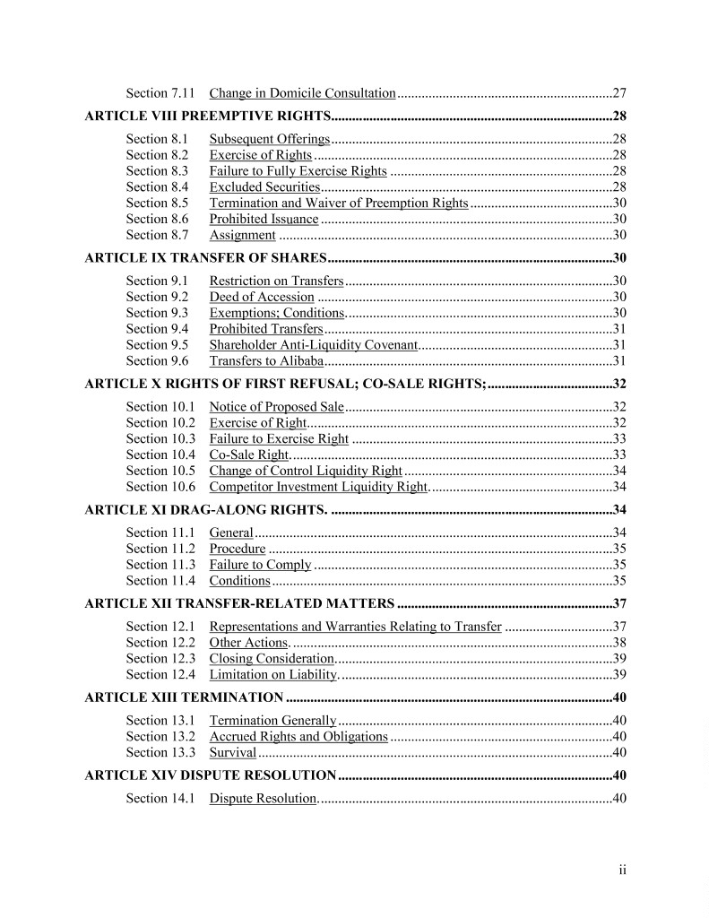 Section 7.11 Change in Domicile Consultation ..............................................................27 ARTICLE VIII PREEMPTIVE RIGHTS.................................................................................28 Section 8.1 Subsequent Offerings .................................................................................28 Section 8.2 Exercise of Rights ......................................................................................28 Section 8.3 Failure to Fully Exercise Rights ................................................................28 Section 8.4 Excluded Securities ....................................................................................28 Section 8.5 Termination and Waiver of Preemption Rights .........................................30 Section 8.6 Prohibited Issuance ....................................................................................30 Section 8.7 Assignment ................................................................................................30 ARTICLE IX TRANSFER OF SHARES ..................................................................................30 Section 9.1 Restriction on Transfers .............................................................................30 Section 9.2 Deed of Accession .....................................................................................30 Section 9.3 Exemptions; Conditions. ............................................................................30 Section 9.4 Prohibited Transfers ...................................................................................31 Section 9.5 Shareholder Anti-Liquidity Covenant........................................................31 Section 9.6 Transfers to Alibaba ...................................................................................31 ARTICLE X RIGHTS OF FIRST REFUSAL; CO-SALE RIGHTS; ....................................32 Section 10.1 Notice of Proposed Sale .............................................................................32 Section 10.2 Exercise of Right........................................................................................32 Section 10.3 Failure to Exercise Right ...........................................................................33 Section 10.4 Co-Sale Right. ............................................................................................33 Section 10.5 Change of Control Liquidity Right ............................................................34 Section 10.6 Competitor Investment Liquidity Right. ....................................................34 ARTICLE XI DRAG-ALONG RIGHTS. .................................................................................34 Section 11.1 General .......................................................................................................34 Section 11.2 Procedure ...................................................................................................35 Section 11.3 Failure to Comply ......................................................................................35 Section 11.4 Conditions ..................................................................................................35 ARTICLE XII TRANSFER-RELATED MATTERS ..............................................................37 Section 12.1 Representations and Warranties Relating to Transfer ...............................37 Section 12.2 Other Actions. ............................................................................................38 Section 12.3 Closing Consideration. ...............................................................................39 Section 12.4 Limitation on Liability. ..............................................................................39 ARTICLE XIII TERMINATION ..............................................................................................40 Section 13.1 Termination Generally ...............................................................................40 Section 13.2 Accrued Rights and Obligations ................................................................40 Section 13.3 Survival ......................................................................................................40 ARTICLE XIV DISPUTE RESOLUTION ...............................................................................40 Section 14.1 Dispute Resolution. ....................................................................................40 ii