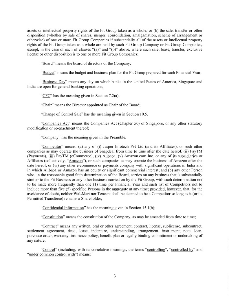 assets or intellectual property rights of the Fit Group taken as a whole; or (b) the sale, transfer or other disposition (whether by sale of shares, merger, consolidation, amalgamation, scheme of arrangement or otherwise) of one or more Fit Group Companies if substantially all of the assets or intellectual property rights of the Fit Group taken as a whole are held by such Fit Group Company or Fit Group Companies, except, in the case of each of clauses “(a)” and “(b)” above, where such sale, lease, transfer, exclusive license or other disposition is to one or more Fit Group Companies; “Board” means the board of directors of the Company; “Budget” means the budget and business plan for the Fit Group prepared for each Financial Year; “Business Day” means any day on which banks in the United States of America, Singapore and India are open for general banking operations; “CFC” has the meaning given in Section 7.2(a); “Chair” means the Director appointed as Chair of the Board; “Change of Control Sale” has the meaning given in Section 10.5. “Companies Act” means the Companies Act (Chapter 50) of Singapore, or any other statutory modification or re-enactment thereof; “Company” has the meaning given in the Preamble. “Competitor” means: (a) any of (i) Jasper Infotech Pvt Ltd (and its Affiliates), or such other companies as may operate the business of Snapdeal from time to time after the date hereof, (ii) PayTM (Payments), (iii) PayTM (eCommerce), (iv) Alibaba, (v) Amazon.com Inc. or any of its subsidiaries or Affiliates (collectively, “Amazon”), or such companies as may operate the business of Amazon after the date hereof; or (vi) any other e-commerce or payments company with significant operations in India and in which Alibaba or Amazon has an equity or significant commercial interest; and (b) any other Person who, in the reasonable good faith determination of the Board, carries on any business that is substantially similar to the Fit Business or any other business carried on by the Fit Group, with such determination not to be made more frequently than one (1) time per Financial Year and such list of Competitors not to include more than five (5) specified Persons in the aggregate at any time; provided, however, that, for the avoidance of doubt, neither Wal-Mart nor Tencent shall be deemed to be a Competitor so long as it (or its Permitted Transferee) remains a Shareholder; “Confidential Information” has the meaning given in Section 15.1(b); “Constitution” means the constitution of the Company, as may be amended from time to time; “Contract” means any written, oral or other agreement, contract, license, sublicense, subcontract, settlement agreement, deed, lease, indenture, understanding, arrangement, instrument, note, loan, purchase order, warranty, insurance policy, benefit plan or legally binding commitment or undertaking of any nature; “Control” (including, with its correlative meanings, the terms “controlling”, “controlled by” and “under common control with”) means: 3