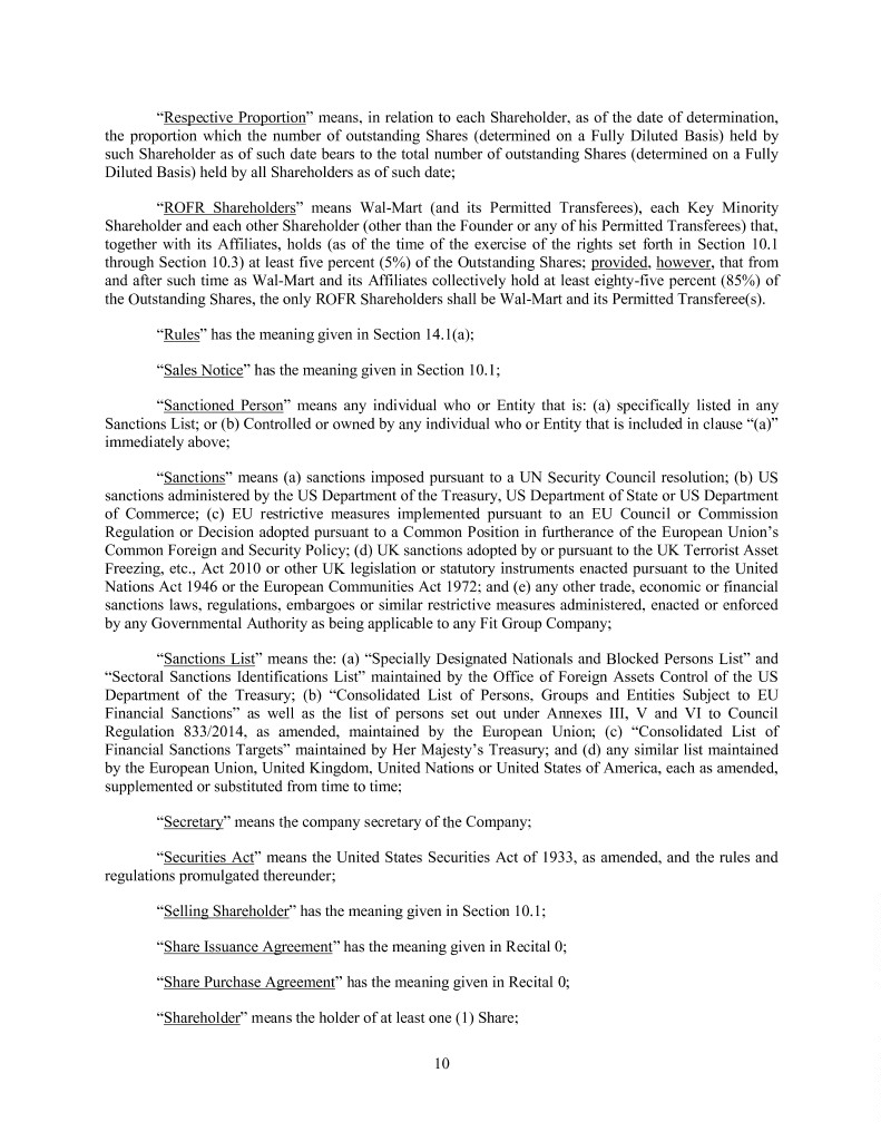 “Respective Proportion” means, in relation to each Shareholder, as of the date of determination, the proportion which the number of outstanding Shares (determined on a Fully Diluted Basis) held by such Shareholder as of such date bears to the total number of outstanding Shares (determined on a Fully Diluted Basis) held by all Shareholders as of such date; “ROFR Shareholders” means Wal-Mart (and its Permitted Transferees), each Key Minority Shareholder and each other Shareholder (other than the Founder or any of his Permitted Transferees) that, together with its Affiliates, holds (as of the time of the exercise of the rights set forth in Section 10.1 through Section 10.3) at least five percent (5%) of the Outstanding Shares; provided, however, that from and after such time as Wal-Mart and its Affiliates collectively hold at least eighty-five percent (85%) of the Outstanding Shares, the only ROFR Shareholders shall be Wal-Mart and its Permitted Transferee(s). “Rules” has the meaning given in Section 14.1(a); “Sales Notice” has the meaning given in Section 10.1; “Sanctioned Person” means any individual who or Entity that is: (a) specifically listed in any Sanctions List; or (b) Controlled or owned by any individual who or Entity that is included in clause “(a)” immediately above; “Sanctions” means (a) sanctions imposed pursuant to a UN Security Council resolution; (b) US sanctions administered by the US Department of the Treasury, US Department of State or US Department of Commerce; (c) EU restrictive measures implemented pursuant to an EU Council or Commission Regulation or Decision adopted pursuant to a Common Position in furtherance of the European Union’s Common Foreign and Security Policy; (d) UK sanctions adopted by or pursuant to the UK Terrorist Asset Freezing, etc., Act 2010 or other UK legislation or statutory instruments enacted pursuant to the United Nations Act 1946 or the European Communities Act 1972; and (e) any other trade, economic or financial sanctions laws, regulations, embargoes or similar restrictive measures administered, enacted or enforced by any Governmental Authority as being applicable to any Fit Group Company; “Sanctions List” means the: (a) “Specially Designated Nationals and Blocked Persons List” and “Sectoral Sanctions Identifications List” maintained by the Office of Foreign Assets Control of the US Department of the Treasury; (b) “Consolidated List of Persons, Groups and Entities Subject to EU Financial Sanctions” as well as the list of persons set out under Annexes III, V and VI to Council Regulation 833/2014, as amended, maintained by the European Union; (c) “Consolidated List of Financial Sanctions Targets” maintained by Her Majesty’s Treasury; and (d) any similar list maintained by the European Union, United Kingdom, United Nations or United States of America, each as amended, supplemented or substituted from time to time; “Secretary” means the company secretary of the Company; “Securities Act” means the United States Securities Act of 1933, as amended, and the rules and regulations promulgated thereunder; “Selling Shareholder” has the meaning given in Section 10.1; “Share Issuance Agreement” has the meaning given in Recital 0; “Share Purchase Agreement” has the meaning given in Recital 0; “Shareholder” means the holder of at least one (1) Share; 10