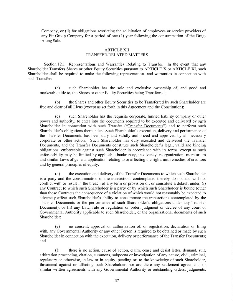 Company, or (ii) for obligations restricting the solicitation of employees or service providers of any Fit Group Company for a period of one (1) year following the consummation of the Drag- Along Sale. ARTICLE XII TRANSFER-RELATED MATTERS Section 12.1 Representations and Warranties Relating to Transfer. In the event that any Shareholder Transfers Shares or other Equity Securities pursuant to ARTICLE X or ARTICLE XI, such Shareholder shall be required to make the following representations and warranties in connection with such Transfer: (a) such Shareholder has the sole and exclusive ownership of, and good and marketable title to, the Shares or other Equity Securities being Transferred; (b) the Shares and other Equity Securities to be Transferred by such Shareholder are free and clear of all Liens (except as set forth in this Agreement and the Constitution); (c) such Shareholder has the requisite corporate, limited liability company or other power and authority, to enter into the documents required to be executed and delivered by such Shareholder in connection with such Transfer (“Transfer Documents”) and to perform such Shareholder’s obligations thereunder. Such Shareholder’s execution, delivery and performance of the Transfer Documents has been duly and validly authorized and approved by all necessary corporate or other action. Such Shareholder has duly executed and delivered the Transfer Documents, and the Transfer Documents constitute such Shareholder’s legal, valid and binding obligations, enforceable against such Shareholder in accordance with its terms, except as such enforceability may be limited by applicable bankruptcy, insolvency, reorganization, moratorium and similar Laws of general application relating to or affecting the rights and remedies of creditors and by general principles of equity; (d) the execution and delivery of the Transfer Documents to which such Shareholder is a party and the consummation of the transactions contemplated thereby do not and will not conflict with or result in the breach of any term or provision of, or constitute a default under, (i) any Contract to which such Shareholder is a party or by which such Shareholder is bound (other than those Contracts the consequence of a violation of which would not reasonably be expected to adversely affect such Shareholder’s ability to consummate the transactions contemplated by the Transfer Documents or the performance of such Shareholder’s obligations under any Transfer Document), or (ii) any Law, rule or regulation or order, judgment or decree of any court or Governmental Authority applicable to such Shareholder, or the organizational documents of such Shareholder; (e) no consent, approval or authorization of, or registration, declaration or filing with, any Governmental Authority or any other Person is required to be obtained or made by such Shareholder in connection with the execution, delivery or performance of the Transfer Documents; and (f) there is no action, cause of action, claim, cease and desist letter, demand, suit, arbitration proceeding, citation, summons, subpoena or investigation of any nature, civil, criminal, regulatory or otherwise, in law or in equity, pending or, to the knowledge of such Shareholder, threatened against or affecting such Shareholder, nor are there any settlement agreements or similar written agreements with any Governmental Authority or outstanding orders, judgments, 37