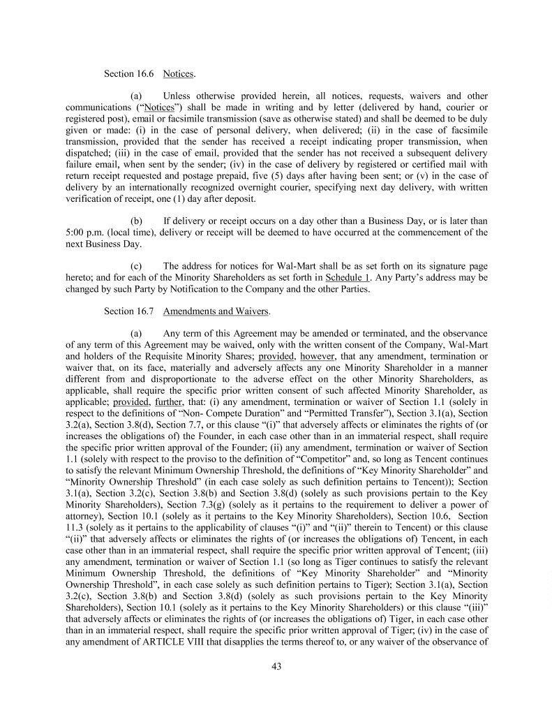 Section 16.6 Notices. (a) Unless otherwise provided herein, all notices, requests, waivers and other communications (“Notices”) shall be made in writing and by letter (delivered by hand, courier or registered post), email or facsimile transmission (save as otherwise stated) and shall be deemed to be duly given or made: (i) in the case of personal delivery, when delivered; (ii) in the case of facsimile transmission, provided that the sender has received a receipt indicating proper transmission, when dispatched; (iii) in the case of email, provided that the sender has not received a subsequent delivery failure email, when sent by the sender; (iv) in the case of delivery by registered or certified mail with return receipt requested and postage prepaid, five (5) days after having been sent; or (v) in the case of delivery by an internationally recognized overnight courier, specifying next day delivery, with written verification of receipt, one (1) day after deposit. (b) If delivery or receipt occurs on a day other than a Business Day, or is later than 5:00 p.m. (local time), delivery or receipt will be deemed to have occurred at the commencement of the next Business Day. (c) The address for notices for Wal-Mart shall be as set forth on its signature page hereto; and for each of the Minority Shareholders as set forth in Schedule 1. Any Party’s address may be changed by such Party by Notification to the Company and the other Parties. Section 16.7 Amendments and Waivers. (a) Any term of this Agreement may be amended or terminated, and the observance of any term of this Agreement may be waived, only with the written consent of the Company, Wal-Mart and holders of the Requisite Minority Shares; provided, however, that any amendment, termination or waiver that, on its face, materially and adversely affects any one Minority Shareholder in a manner different from and disproportionate to the adverse effect on the other Minority Shareholders, as applicable, shall require the specific prior written consent of such affected Minority Shareholder, as applicable; provided, further, that: (i) any amendment, termination or waiver of Section 1.1 (solely in respect to the definitions of “Non- Compete Duration” and “Permitted Transfer”), Section 3.1(a), Section 3.2(a), Section 3.8(d), Section 7.7, or this clause “(i)” that adversely affects or eliminates the rights of (or increases the obligations of) the Founder, in each case other than in an immaterial respect, shall require the specific prior written approval of the Founder; (ii) any amendment, termination or waiver of Section 1.1 (solely with respect to the proviso to the definition of “Competitor” and, so long as Tencent continues to satisfy the relevant Minimum Ownership Threshold, the definitions of “Key Minority Shareholder” and “Minority Ownership Threshold” (in each case solely as such definition pertains to Tencent)); Section 3.1(a), Section 3.2(c), Section 3.8(b) and Section 3.8(d) (solely as such provisions pertain to the Key Minority Shareholders), Section 7.3(g) (solely as it pertains to the requirement to deliver a power of attorney), Section 10.1 (solely as it pertains to the Key Minority Shareholders), Section 10.6, Section 11.3 (solely as it pertains to the applicability of clauses “(i)” and “(ii)” therein to Tencent) or this clause “(ii)” that adversely affects or eliminates the rights of (or increases the obligations of) Tencent, in each case other than in an immaterial respect, shall require the specific prior written approval of Tencent; (iii) any amendment, termination or waiver of Section 1.1 (so long as Tiger continues to satisfy the relevant Minimum Ownership Threshold, the definitions of “Key Minority Shareholder” and “Minority Ownership Threshold”, in each case solely as such definition pertains to Tiger); Section 3.1(a), Section 3.2(c), Section 3.8(b) and Section 3.8(d) (solely as such provisions pertain to the Key Minority Shareholders), Section 10.1 (solely as it pertains to the Key Minority Shareholders) or this clause “(iii)” that adversely affects or eliminates the rights of (or increases the obligations of) Tiger, in each case other than in an immaterial respect, shall require the specific prior written approval of Tiger; (iv) in the case of any amendment of ARTICLE VIII that disapplies the terms thereof to, or any waiver of the observance of 43