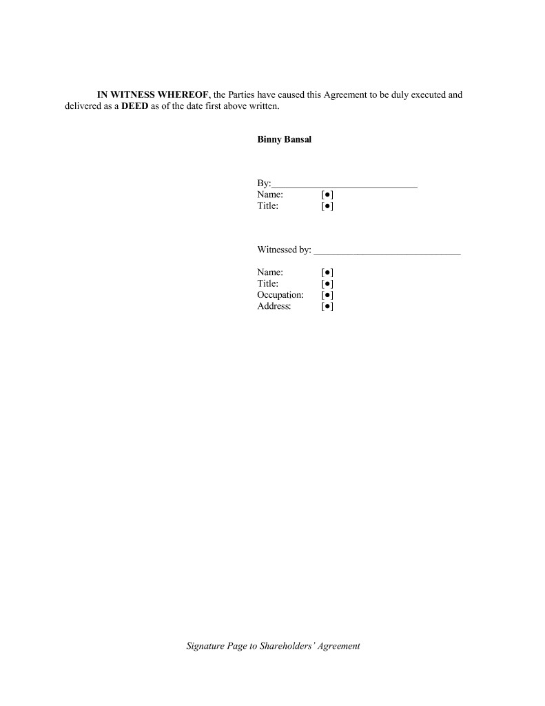 IN WITNESS WHEREOF, the Parties have caused this Agreement to be duly executed and delivered as a DEED as of the date first above written. Binny Bansal By: Name: [●] Title: [●] Witnessed by: ______________________________ Name: [●] Title: [●] Occupation: [●] Address: [●] Signature Page to Shareholders’ Agreement