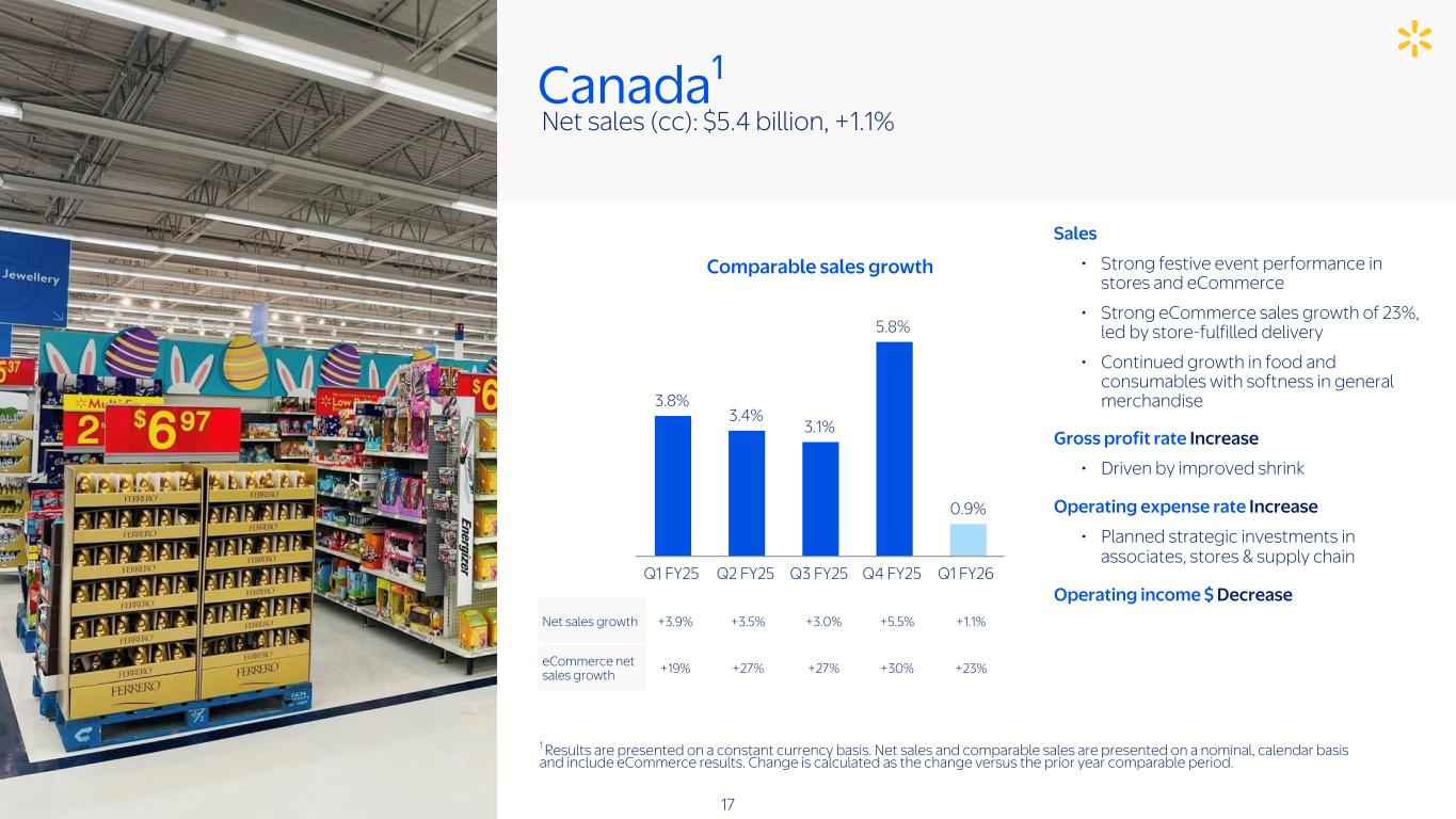 Sales • In Mexico, comp sales grew 1.4%, led by Sam’s Club • Double-digit eCommerce growth driven by On-Demand store-fulfilled delivery • Mexico growth affected by last year’s accelerated payments from government social programs and timing of Easter • Opened 188 new stores in the past 12 months, including 20 new stores in the quarter Gross profit rate Increase • Driven by business mix changes, partially offset by increased supply chain costs Operating expense rate Increase • Planned investments in associate wages and strategic priorities Operating income $ Decrease Net sales growth +10.8% +6.4% +5.9% +5.6% +3.0% eCommerce net sales growth +24% +19% +19% +20% +19% 1 Results are presented on a constant currency basis. Net sales and comparable sales are presented on a nominal, calendar basis and include eCommerce results. Change is calculated as the change versus the prior year comparable period. 2 Walmex includes the consolidated results of Mexico and Central America Walmex1,2 Net sales (cc): $13.6 billion, +3.0% 9.2% 5.0% 4.4% 4.1% 1.5% Q1 FY25 Q2 FY25 Q3 FY25 Q4 FY25 Q1 FY26 16 Comparable sales growth
