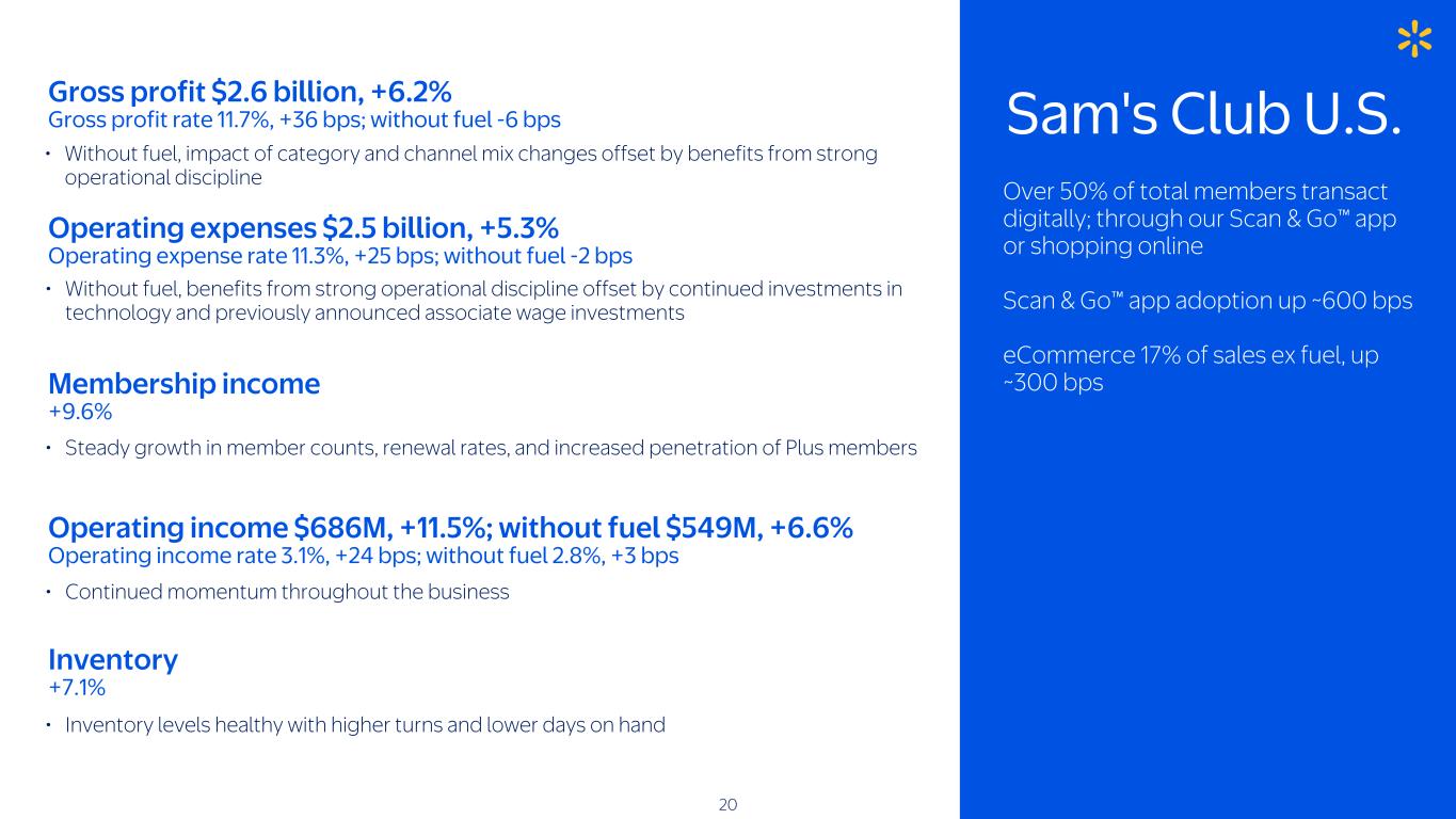Net sales $22.1 billion, +2.9%, Net sales without fuel +5.5%, eCommerce +27% • Continued strength in grocery and health & wellness; fourth consecutive quarter of positive general merchandise sales • Comp sales driven by increases in transactions and unit volumes ◦ Transactions ex fuel: +4.8% ◦ Average ticket ex fuel: +1.7% • eCommerce delivery growth of ~160% • Share gains in grocery and general merchandise categories (per Circana) • Member's Mark grew low double-digits, outpacing segment comp eComm Cont. without fuel +180 bps +230 bps +290 bps +280 bps +350 bps 1 Comp sales for the 13-week period ended May 2, 2025 compared to the 13-week period ended May 3, 2024. Sam’s Club U.S. revenues 3.5% 4.6% 3.7% 5.3% 4.0% 4.4% 5.2% 7.0% 6.8% 6.7% With fuel Without fuel Q1 FY25 Q2 FY25 Q3 FY25 Q4 FY25 Q1 FY26 19 Sam's Club U.S. comp sales1