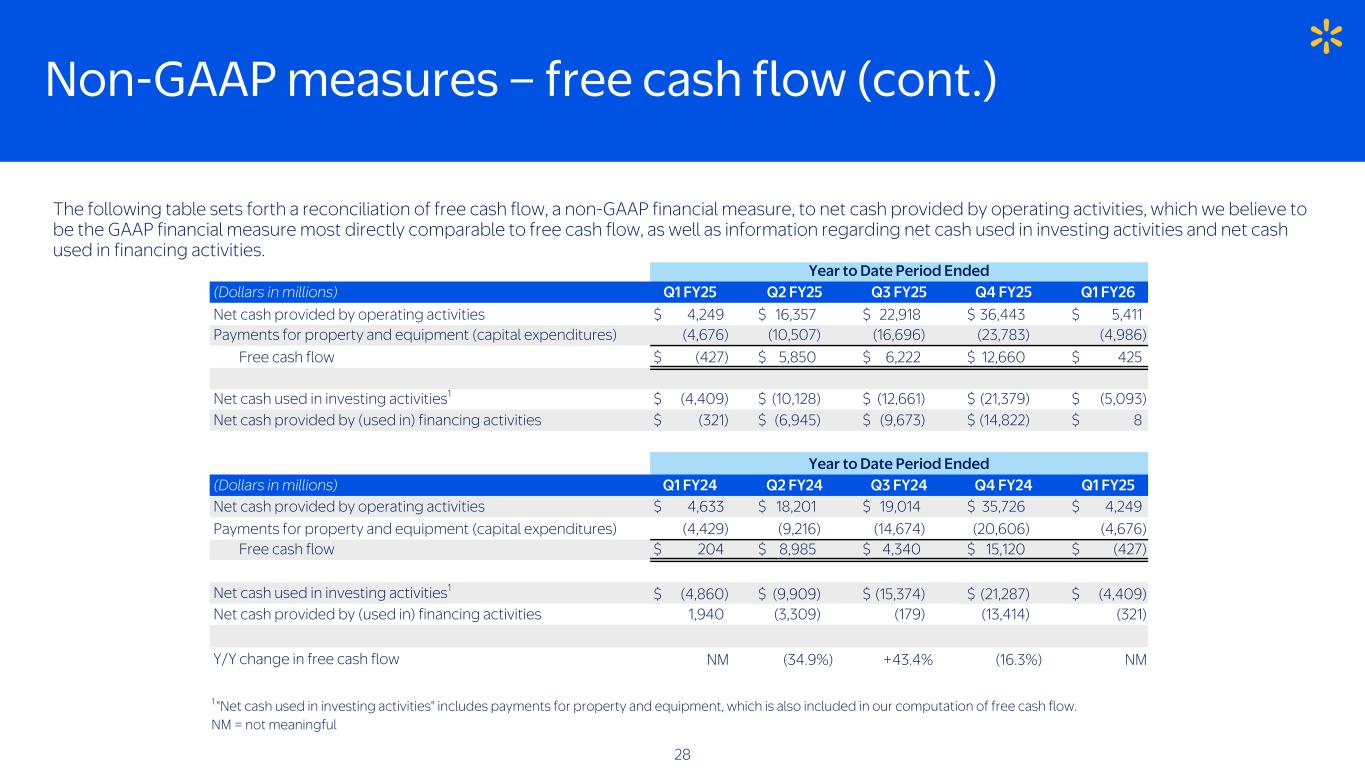 Non-GAAP measures – free cash flow We define free cash flow as net cash provided by operating activities in a period minus payments for property and equipment made in that period. Net cash provided by operating activities was $5.4 billion for the three months ended April 30, 2025, which represents an increase of $1.2 billion when compared to the same period in the prior year. The increase was primarily due to an increase in cash provided by operating income and timing of certain payments. Free cash flow for the three months ended April 30, 2025 was $0.4 billion, which represents an increase of $0.9 billion when compared to the same period in the prior year. The increase in free cash flow was due to the increase in net cash provided by operating activities described above, partially offset by an increase of $0.3 billion in capital expenditures to support our investment strategy. Free cash flow is considered a non-GAAP financial measure. Management believes, however, that free cash flow, which measures our ability to generate additional cash from our business operations, is an important financial measure for use in evaluating the Company's financial performance. Free cash flow should be considered in addition to, rather than as a substitute for, consolidated net income as a measure of our performance and net cash provided by operating activities as a measure of our liquidity. Walmart’s definition of free cash flow is limited, in that it does not represent residual cash flows available for discretionary expenditures, due to the fact that the measure does not deduct the payments required for debt service and other contractual obligations or payments made for business acquisitions. Therefore, we believe it is important to view free cash flow as a measure that provides supplemental information to our Consolidated Statements of Cash Flows. Although other companies report their free cash flow, numerous methods may exist for calculating a company’s free cash flow. As a result, the method used by Walmart’s management to calculate our free cash flow may differ from the methods used by other companies to calculate their free cash flow. 27