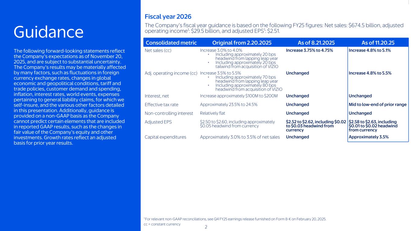 Fiscal year 2026 The Company’s fiscal year guidance is based on the following FY25 figures: Net sales: $674.5 billion, adjusted operating income1: $29.5 billion, and adjusted EPS1: $2.51. Consolidated metric Original from 2.20.2025 As of 8.21.2025 As of 11.20.25 Net sales (cc) Increase 3.0% to 4.0% • Including approximately 20 bps headwind from lapping leap year • Including approximately 20 bps tailwind from acquisition of VIZIO Increase 3.75% to 4.75% Increase 4.8% to 5.1% Adj. operating income (cc) Increase 3.5% to 5.5% • Including approximately 70 bps headwind from lapping leap year • Including approximately 80 bps headwind from acquisition of VIZIO Unchanged Increase 4.8% to 5.5% Interest, net Increase approximately $100M to $200M Unchanged Unchanged Effective tax rate Approximately 23.5% to 24.5% Unchanged Mid to low-end of prior range Non-controlling interest Relatively flat Unchanged Unchanged Adjusted EPS $2.50 to $2.60, including approximately $0.05 headwind from currency $2.52 to $2.62, including $0.02 to $0.03 headwind from currency $2.58 to $2.63, including $0.01 to $0.02 headwind from currency Capital expenditures Approximately 3.0% to 3.5% of net sales Unchanged Approximately 3.5% 1 For relevant non-GAAP reconciliations, see Q4 FY25 earnings release furnished on Form 8-K on February 20, 2025. cc = constant currency Guidance 2 The following forward-looking statements reflect the Company’s expectations as of November 20, 2025, and are subject to substantial uncertainty. The Company’s results may be materially affected by many factors, such as fluctuations in foreign currency exchange rates, changes in global economic and geopolitical conditions, tariff and trade policies, customer demand and spending, inflation, interest rates, world events, expenses pertaining to general liability claims, for which we self-insure, and the various other factors detailed in this presentation. Additionally, guidance is provided on a non-GAAP basis as the Company cannot predict certain elements that are included in reported GAAP results, such as the changes in fair value of the Company’s equity and other investments. Growth rates reflect an adjusted basis for prior year results.