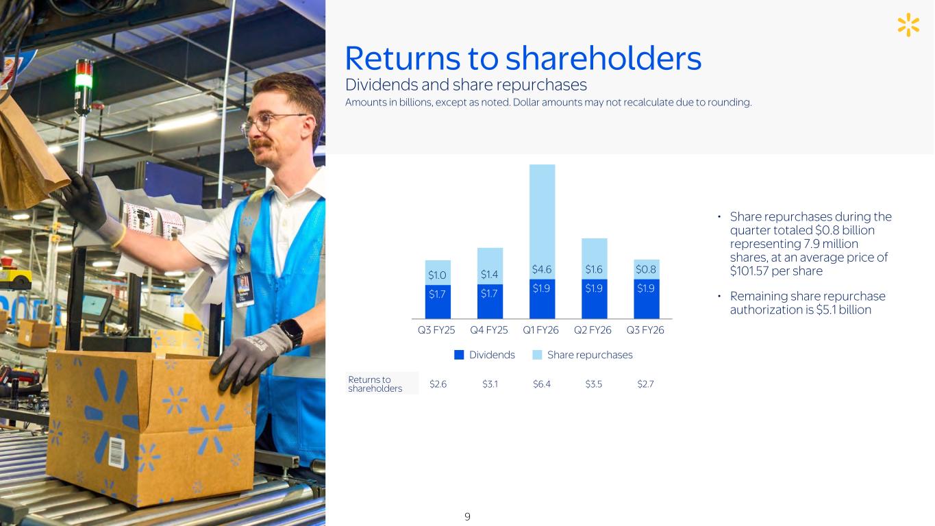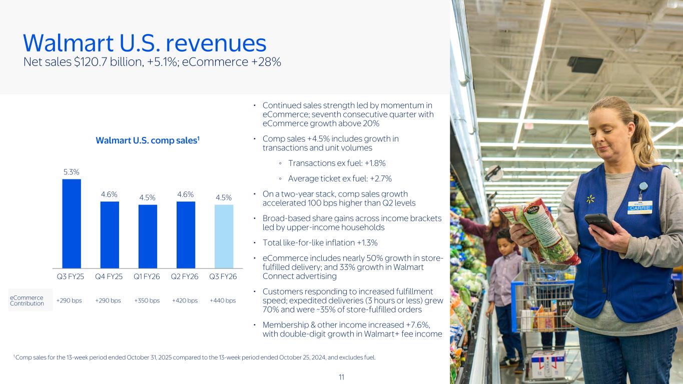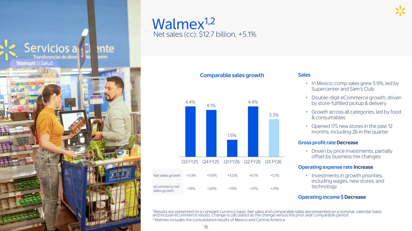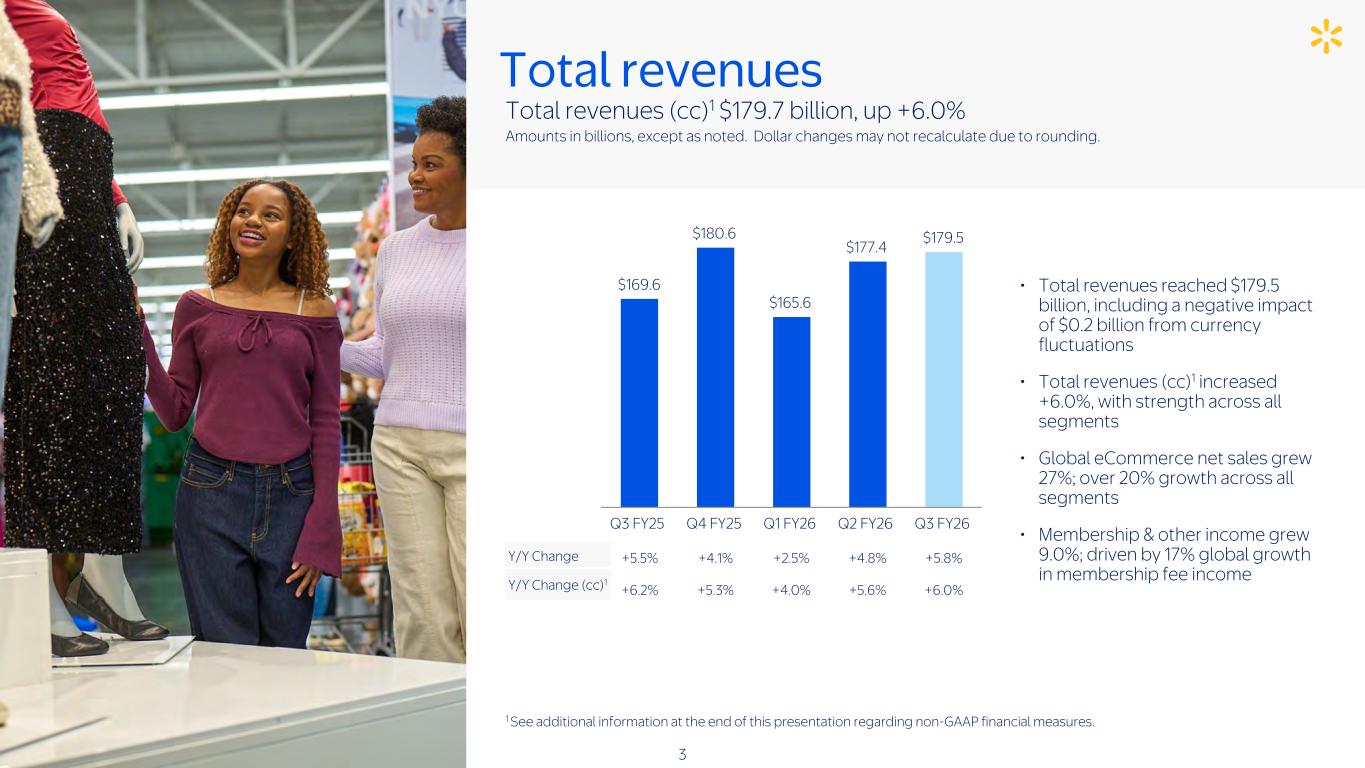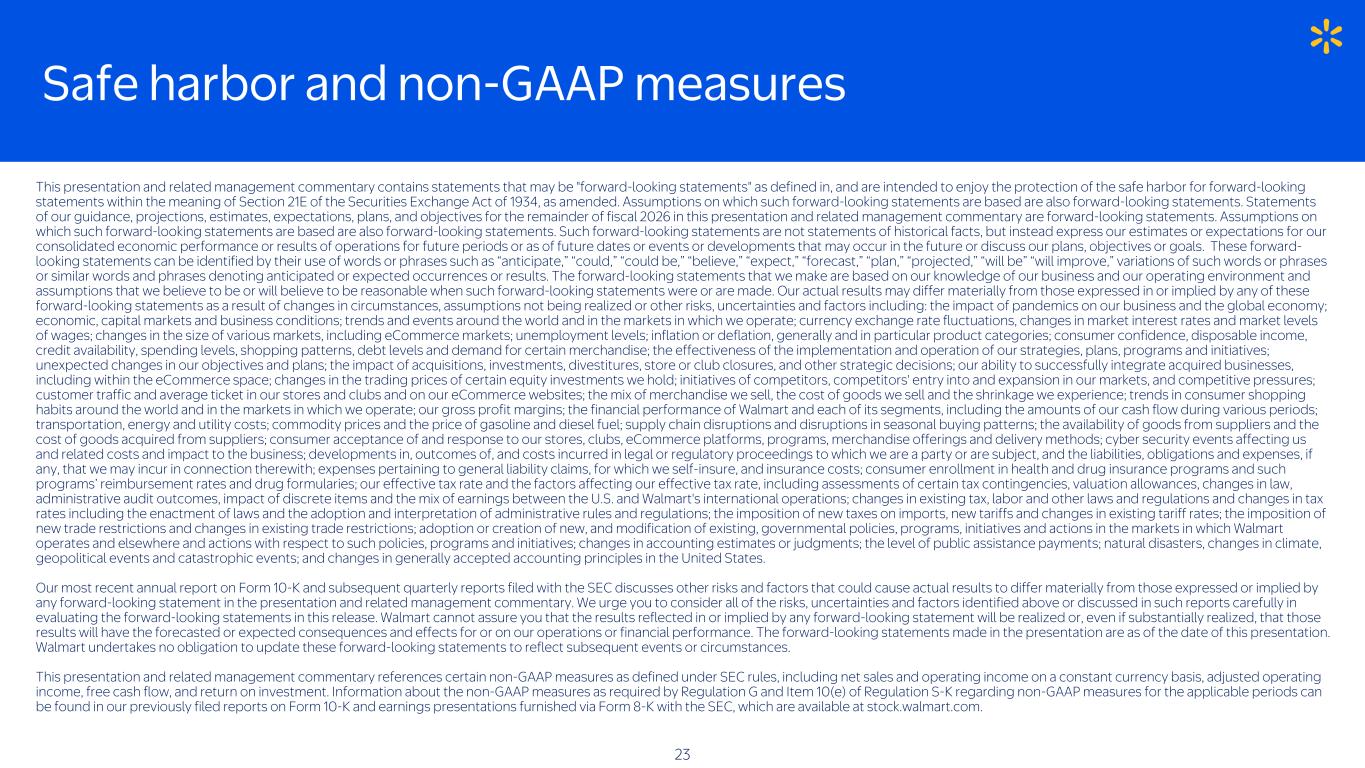 Safe harbor and non-GAAP measures This presentation and related management commentary contains statements that may be "forward-looking statements" as defined in, and are intended to enjoy the protection of the safe harbor for forward-looking statements within the meaning of Section 21E of the Securities Exchange Act of 1934, as amended. Assumptions on which such forward-looking statements are based are also forward-looking statements. Statements of our guidance, projections, estimates, expectations, plans, and objectives for the remainder of fiscal 2026 in this presentation and related management commentary are forward-looking statements. Assumptions on which such forward-looking statements are based are also forward-looking statements. Such forward-looking statements are not statements of historical facts, but instead express our estimates or expectations for our consolidated economic performance or results of operations for future periods or as of future dates or events or developments that may occur in the future or discuss our plans, objectives or goals. These forward- looking statements can be identified by their use of words or phrases such as “anticipate,” “could,” “could be,” “believe,” “expect,” “forecast,” “plan,” “projected,” “will be” “will improve,” variations of such words or phrases or similar words and phrases denoting anticipated or expected occurrences or results. The forward-looking statements that we make are based on our knowledge of our business and our operating environment and assumptions that we believe to be or will believe to be reasonable when such forward-looking statements were or are made. Our actual results may differ materially from those expressed in or implied by any of these forward-looking statements as a result of changes in circumstances, assumptions not being realized or other risks, uncertainties and factors including: the impact of pandemics on our business and the global economy; economic, capital markets and business conditions; trends and events around the world and in the markets in which we operate; currency exchange rate fluctuations, changes in market interest rates and market levels of wages; changes in the size of various markets, including eCommerce markets; unemployment levels; inflation or deflation, generally and in particular product categories; consumer confidence, disposable income, credit availability, spending levels, shopping patterns, debt levels and demand for certain merchandise; the effectiveness of the implementation and operation of our strategies, plans, programs and initiatives; unexpected changes in our objectives and plans; the impact of acquisitions, investments, divestitures, store or club closures, and other strategic decisions; our ability to successfully integrate acquired businesses, including within the eCommerce space; changes in the trading prices of certain equity investments we hold; initiatives of competitors, competitors' entry into and expansion in our markets, and competitive pressures; customer traffic and average ticket in our stores and clubs and on our eCommerce websites; the mix of merchandise we sell, the cost of goods we sell and the shrinkage we experience; trends in consumer shopping habits around the world and in the markets in which we operate; our gross profit margins; the financial performance of Walmart and each of its segments, including the amounts of our cash flow during various periods; transportation, energy and utility costs; commodity prices and the price of gasoline and diesel fuel; supply chain disruptions and disruptions in seasonal buying patterns; the availability of goods from suppliers and the cost of goods acquired from suppliers; consumer acceptance of and response to our stores, clubs, eCommerce platforms, programs, merchandise offerings and delivery methods; cyber security events affecting us and related costs and impact to the business; developments in, outcomes of, and costs incurred in legal or regulatory proceedings to which we are a party or are subject, and the liabilities, obligations and expenses, if any, that we may incur in connection therewith; expenses pertaining to general liability claims, for which we self-insure, and insurance costs; consumer enrollment in health and drug insurance programs and such programs’ reimbursement rates and drug formularies; our effective tax rate and the factors affecting our effective tax rate, including assessments of certain tax contingencies, valuation allowances, changes in law, administrative audit outcomes, impact of discrete items and the mix of earnings between the U.S. and Walmart's international operations; changes in existing tax, labor and other laws and regulations and changes in tax rates including the enactment of laws and the adoption and interpretation of administrative rules and regulations; the imposition of new taxes on imports, new tariffs and changes in existing tariff rates; the imposition of new trade restrictions and changes in existing trade restrictions; adoption or creation of new, and modification of existing, governmental policies, programs, initiatives and actions in the markets in which Walmart operates and elsewhere and actions with respect to such policies, programs and initiatives; changes in accounting estimates or judgments; the level of public assistance payments; natural disasters, changes in climate, geopolitical events and catastrophic events; and changes in generally accepted accounting principles in the United States. Our most recent annual report on Form 10-K and subsequent quarterly reports filed with the SEC discusses other risks and factors that could cause actual results to differ materially from those expressed or implied by any forward-looking statement in the presentation and related management commentary. We urge you to consider all of the risks, uncertainties and factors identified above or discussed in such reports carefully in evalua