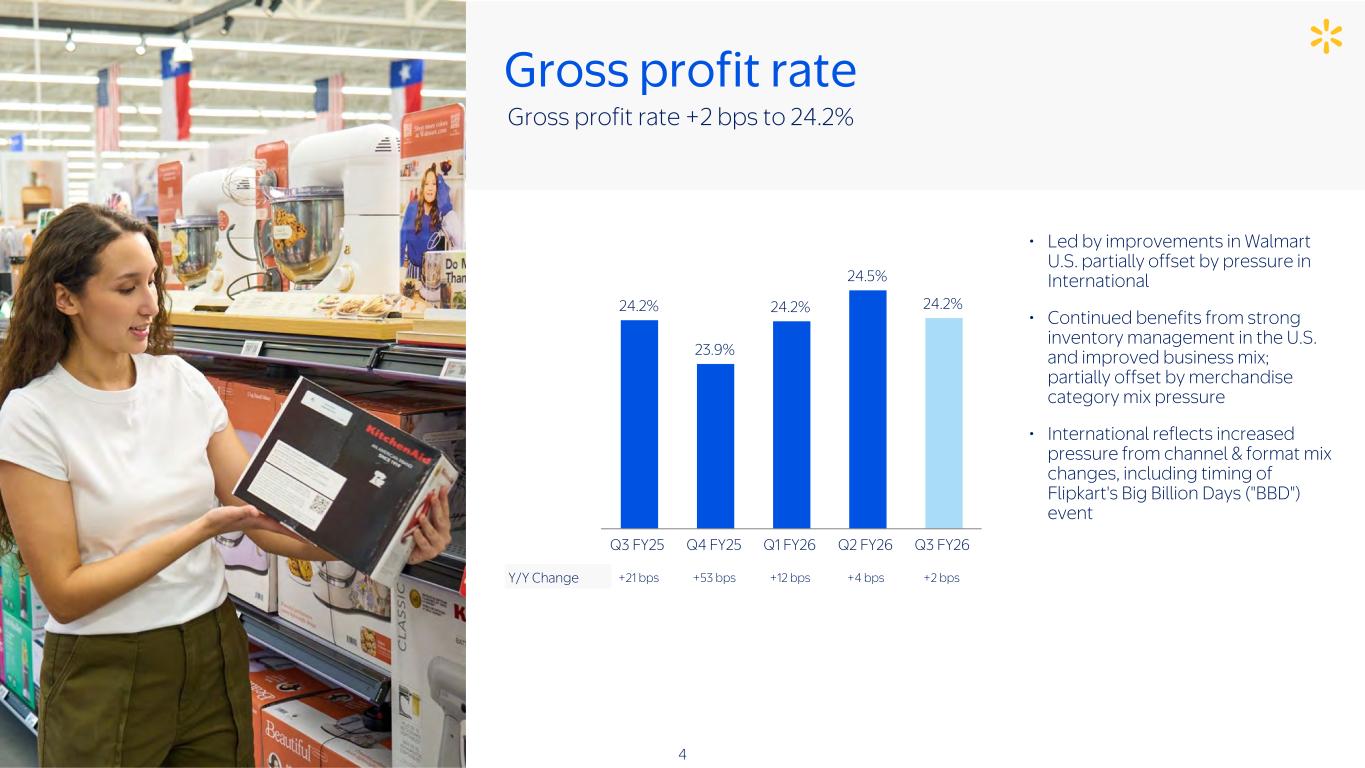• Led by improvements in Walmart U.S. partially offset by pressure in International • Continued benefits from strong inventory management in the U.S. and improved business mix; partially offset by merchandise category mix pressure • International reflects increased pressure from channel & format mix changes, including timing of Flipkart's Big Billion Days ("BBD") event Y/Y Change +21 bps +53 bps +12 bps +4 bps +2 bps Gross profit rate 24.2% 23.9% 24.2% 24.5% 24.2% Q3 FY25 Q4 FY25 Q1 FY26 Q2 FY26 Q3 FY26 Gross profit rate +2 bps to 24.2% 4