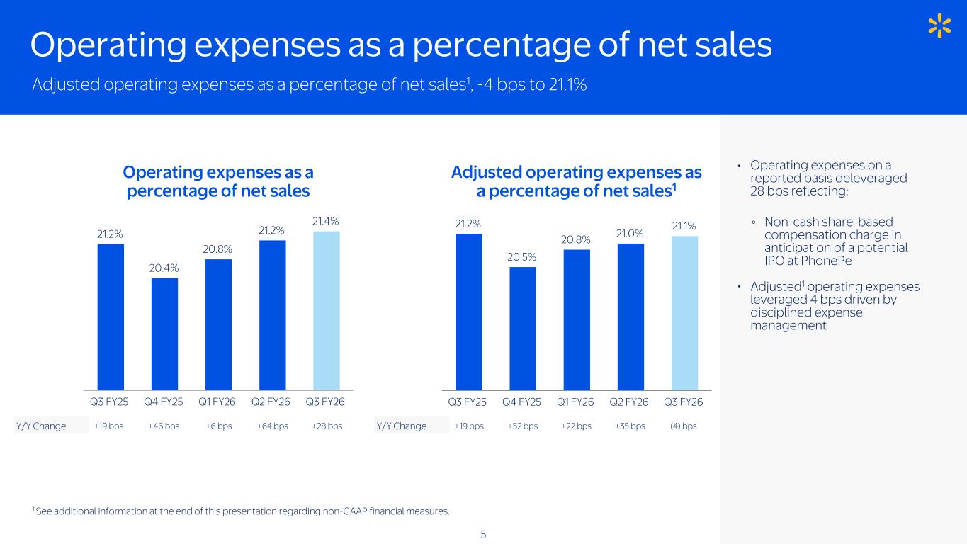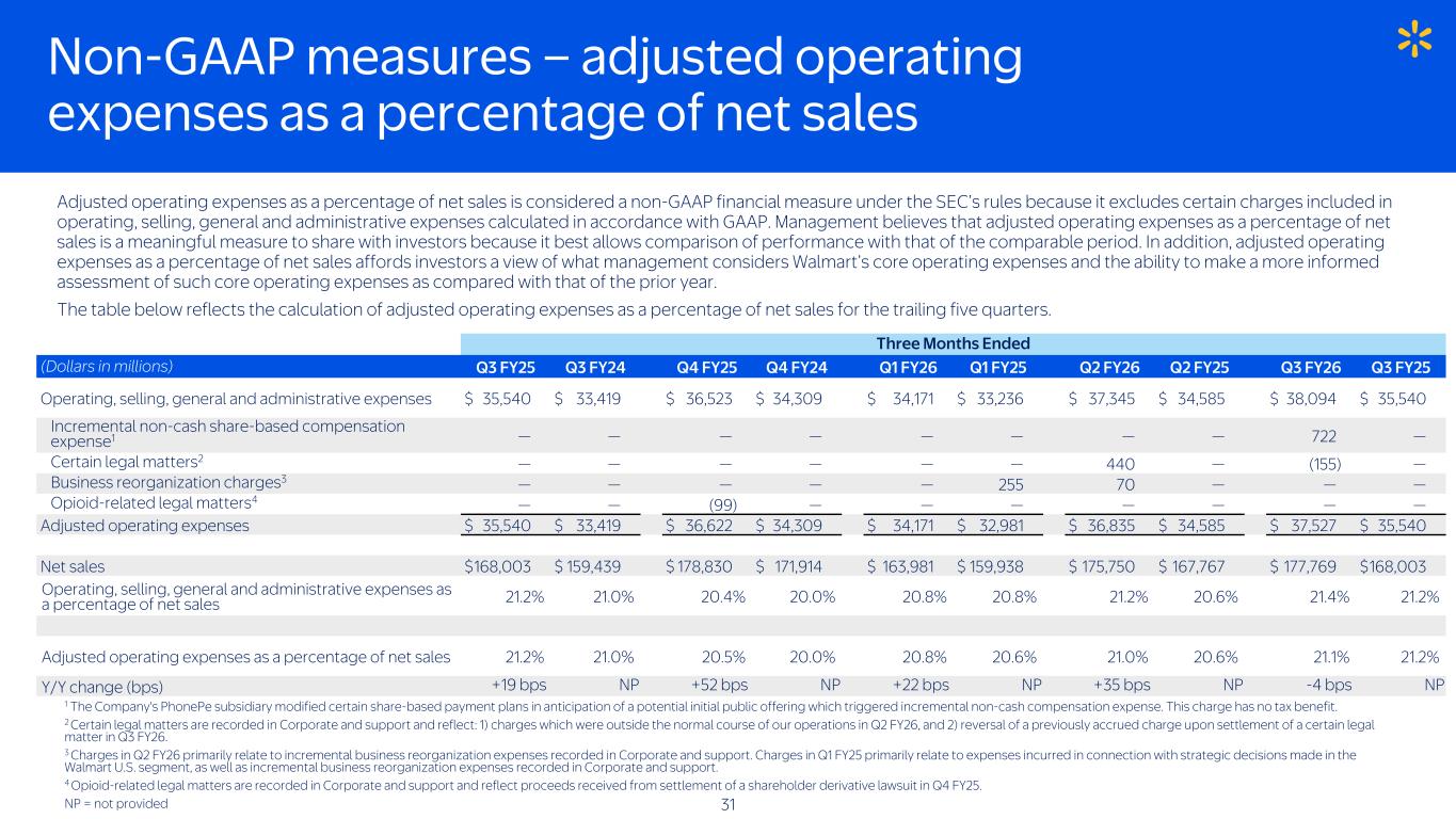Non-GAAP measures – adjusted operating expenses as a percentage of net sales Three Months Ended (Dollars in millions) Q3 FY25 Q3 FY24 Q4 FY25 Q4 FY24 Q1 FY26 Q1 FY25 Q2 FY26 Q2 FY25 Q3 FY26 Q3 FY25 Operating, selling, general and administrative expenses $ 35,540 $ 33,419 $ 36,523 $ 34,309 $ 34,171 $ 33,236 $ 37,345 $ 34,585 $ 38,094 $ 35,540 Incremental non-cash share-based compensation expense1 — — — — — — — — 722 — Certain legal matters2 — — — — — — 440 — (155) — Business reorganization charges3 — — — — — 255 70 — — — Opioid-related legal matters4 — — (99) — — — — — — — Adjusted operating expenses $ 35,540 $ 33,419 $ 36,622 $ 34,309 $ 34,171 $ 32,981 $ 36,835 $ 34,585 $ 37,527 $ 35,540 Net sales $ 168,003 $ 159,439 $ 178,830 $ 171,914 $ 163,981 $ 159,938 $ 175,750 $ 167,767 $ 177,769 $ 168,003 Operating, selling, general and administrative expenses as a percentage of net sales 21.2% 21.0% 20.4% 20.0% 20.8% 20.8% 21.2% 20.6% 21.4% 21.2% Adjusted operating expenses as a percentage of net sales 21.2% 21.0% 20.5% 20.0% 20.8% 20.6% 21.0% 20.6% 21.1% 21.2% Y/Y change (bps) +19 bps NP +52 bps NP +22 bps NP +35 bps NP -4 bps NP 1 The Company's PhonePe subsidiary modified certain share-based payment plans in anticipation of a potential initial public offering which triggered incremental non-cash compensation expense. This charge has no tax benefit. 2 Certain legal matters are recorded in Corporate and support and reflect: 1) charges which were outside the normal course of our operations in Q2 FY26, and 2) reversal of a previously accrued charge upon settlement of a certain legal matter in Q3 FY26. 3 Charges in Q2 FY26 primarily relate to incremental business reorganization expenses recorded in Corporate and support. Charges in Q1 FY25 primarily relate to expenses incurred in connection with strategic decisions made in the Walmart U.S. segment, as well as incremental business reorganization expenses recorded in Corporate and support. 4 Opioid-related legal matters are recorded in Corporate and support and reflect proceeds received from settlement of a shareholder derivative lawsuit in Q4 FY25. NP = not provided Adjusted operating expenses as a percentage of net sales is considered a non-GAAP financial measure under the SEC’s rules because it excludes certain charges included in operating, selling, general and administrative expenses calculated in accordance with GAAP. Management believes that adjusted operating expenses as a percentage of net sales is a meaningful measure to share with investors because it best allows comparison of performance with that of the comparable period. In addition, adjusted operating expenses as a percentage of net sales affords investors a view of what management considers Walmart’s core operating expenses and the ability to make a more informed assessment of such core operating expenses as compared with that of the prior year. The table below reflects the calculation of adjusted operating expenses as a percentage of net sales for the trailing five quarters. 31