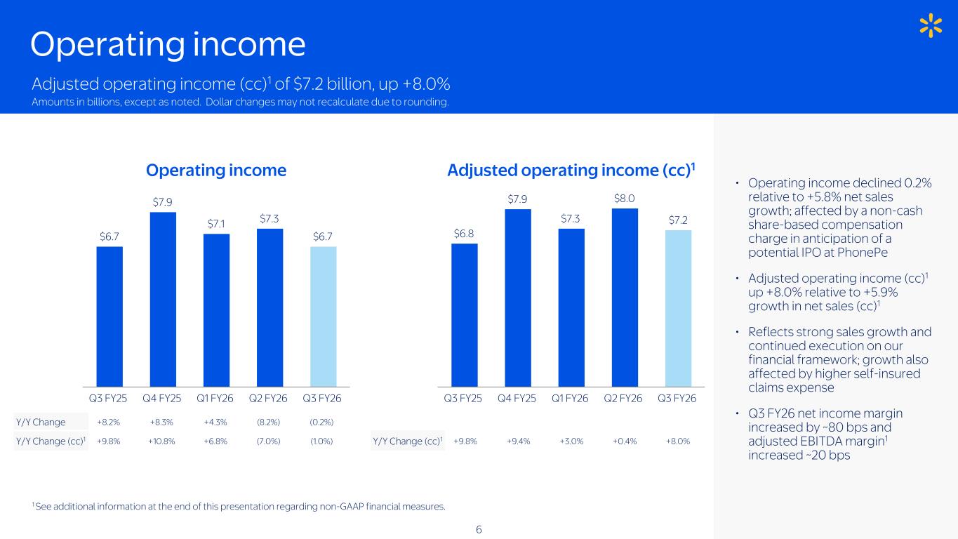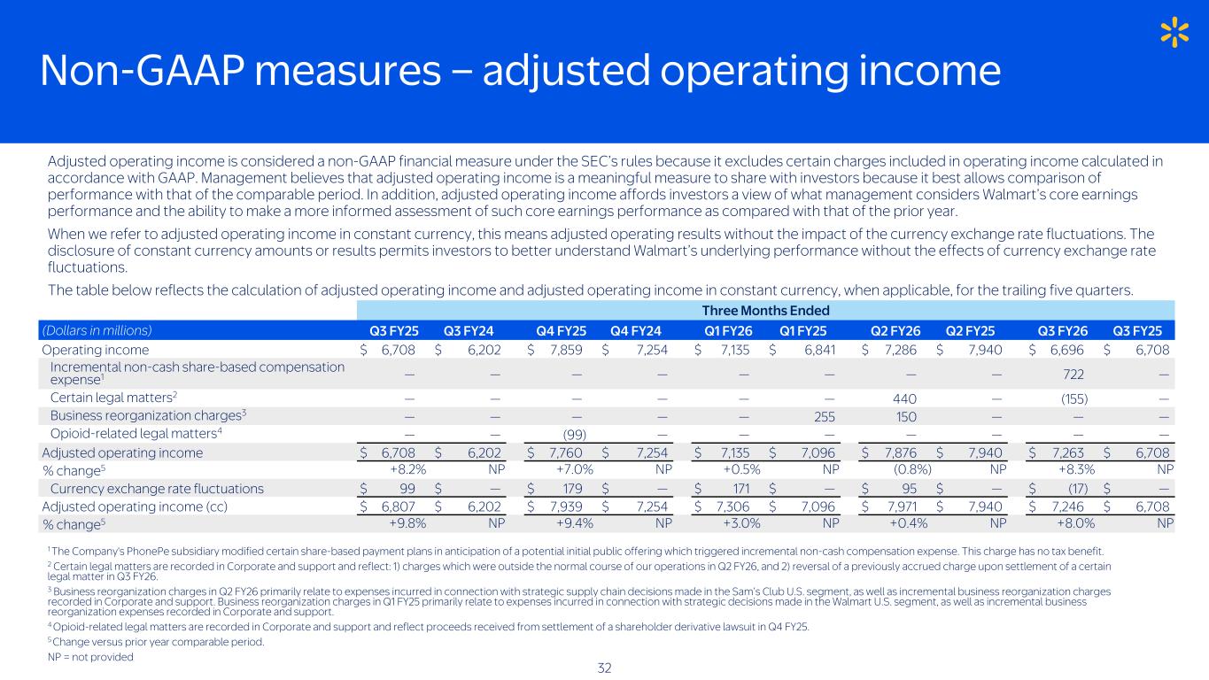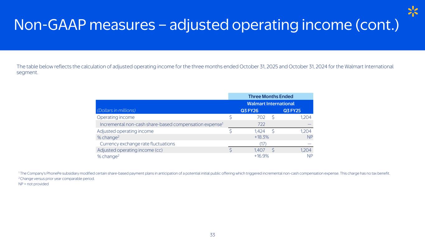 Non-GAAP measures – adjusted operating income Three Months Ended (Dollars in millions) Q3 FY25 Q3 FY24 Q4 FY25 Q4 FY24 Q1 FY26 Q1 FY25 Q2 FY26 Q2 FY25 Q3 FY26 Q3 FY25 Operating income $ 6,708 $ 6,202 $ 7,859 $ 7,254 $ 7,135 $ 6,841 $ 7,286 $ 7,940 $ 6,696 $ 6,708 Incremental non-cash share-based compensation expense1 — — — — — — — — 722 — Certain legal matters2 — — — — — — 440 — (155) — Business reorganization charges3 — — — — — 255 150 — — — Opioid-related legal matters4 — — (99) — — — — — — — Adjusted operating income $ 6,708 $ 6,202 $ 7,760 $ 7,254 $ 7,135 $ 7,096 $ 7,876 $ 7,940 $ 7,263 $ 6,708 % change5 +8.2% NP +7.0% NP +0.5% NP (0.8%) NP +8.3% NP Currency exchange rate fluctuations $ 99 $ — $ 179 $ — $ 171 $ — $ 95 $ — $ (17) $ — Adjusted operating income (cc) $ 6,807 $ 6,202 $ 7,939 $ 7,254 $ 7,306 $ 7,096 $ 7,971 $ 7,940 $ 7,246 $ 6,708 % change5 +9.8% NP +9.4% NP +3.0% NP +0.4% NP +8.0% NP Adjusted operating income is considered a non-GAAP financial measure under the SEC’s rules because it excludes certain charges included in operating income calculated in accordance with GAAP. Management believes that adjusted operating income is a meaningful measure to share with investors because it best allows comparison of performance with that of the comparable period. In addition, adjusted operating income affords investors a view of what management considers Walmart’s core earnings performance and the ability to make a more informed assessment of such core earnings performance as compared with that of the prior year. When we refer to adjusted operating income in constant currency, this means adjusted operating results without the impact of the currency exchange rate fluctuations. The disclosure of constant currency amounts or results permits investors to better understand Walmart’s underlying performance without the effects of currency exchange rate fluctuations. The table below reflects the calculation of adjusted operating income and adjusted operating income in constant currency, when applicable, for the trailing five quarters. 1 The Company's PhonePe subsidiary modified certain share-based payment plans in anticipation of a potential initial public offering which triggered incremental non-cash compensation expense. This charge has no tax benefit. 2 Certain legal matters are recorded in Corporate and support and reflect: 1) charges which were outside the normal course of our operations in Q2 FY26, and 2) reversal of a previously accrued charge upon settlement of a certain legal matter in Q3 FY26. 3 Business reorganization charges in Q2 FY26 primarily relate to expenses incurred in connection with strategic supply chain decisions made in the Sam’s Club U.S. segment, as well as incremental business reorganization charges recorded in Corporate and support. Business reorganization charges in Q1 FY25 primarily relate to expenses incurred in connection with strategic decisions made in the Walmart U.S. segment, as well as incremental business reorganization expenses recorded in Corporate and support. 4 Opioid-related legal matters are recorded in Corporate and support and reflect proceeds received from settlement of a shareholder derivative lawsuit in Q4 FY25. 5 Change versus prior year comparable period. NP = not provided 32