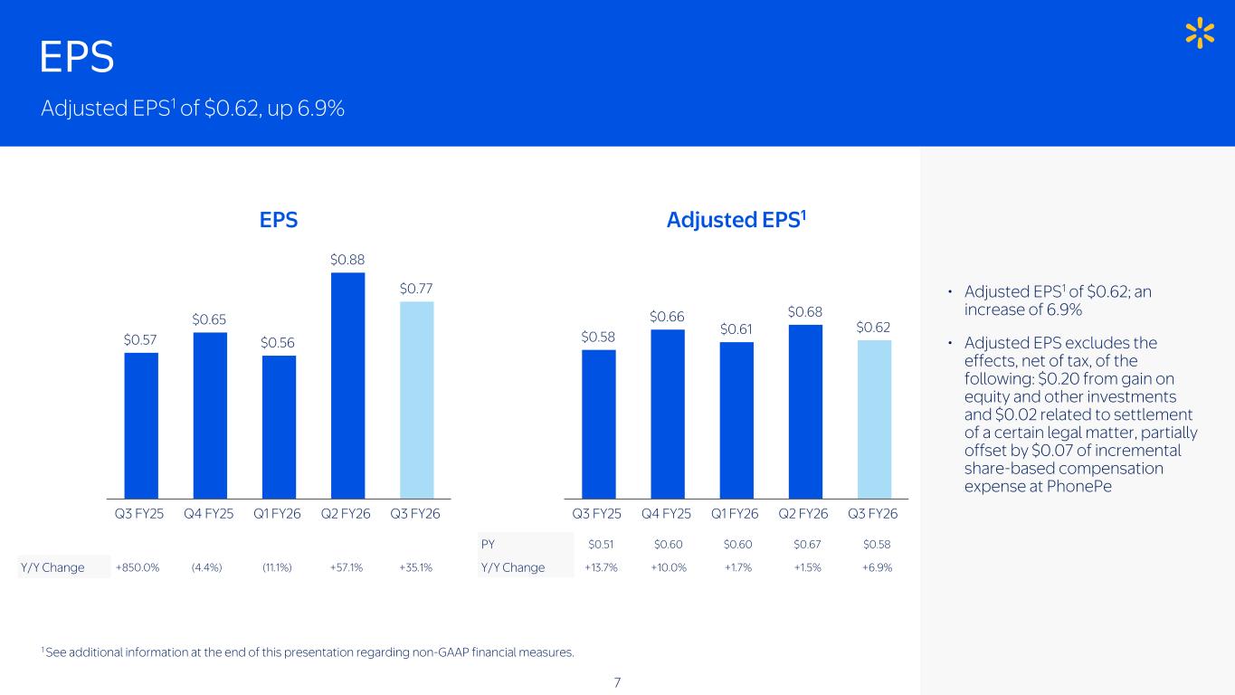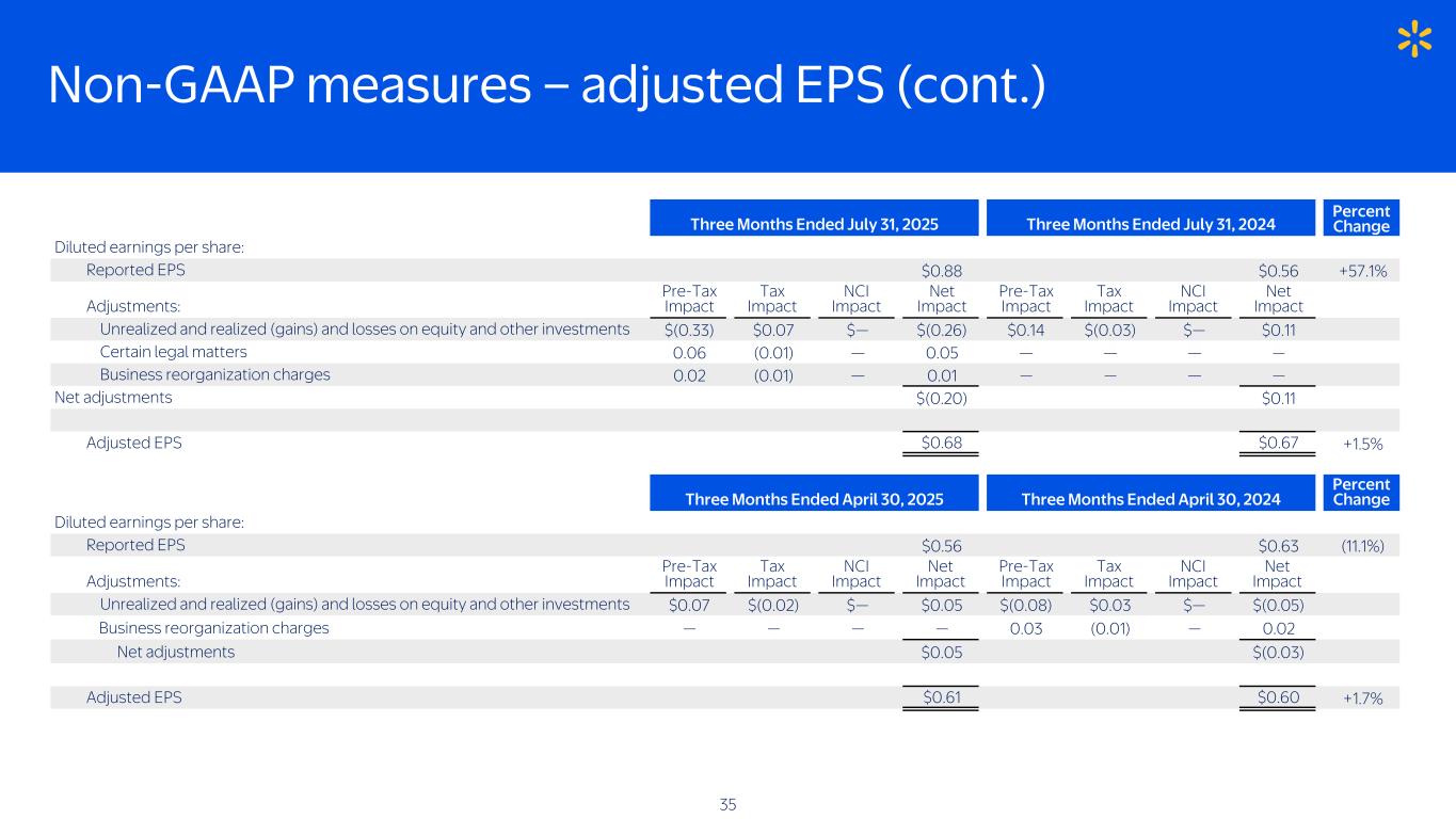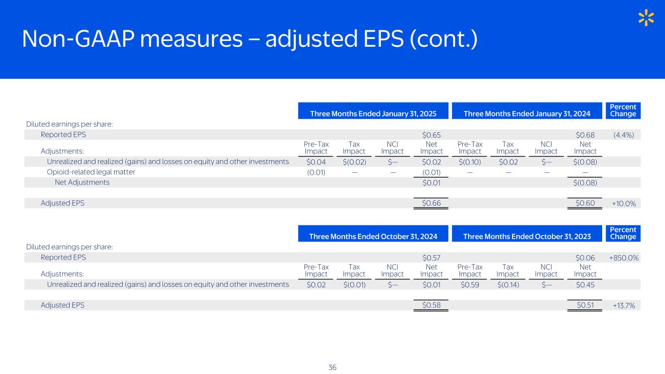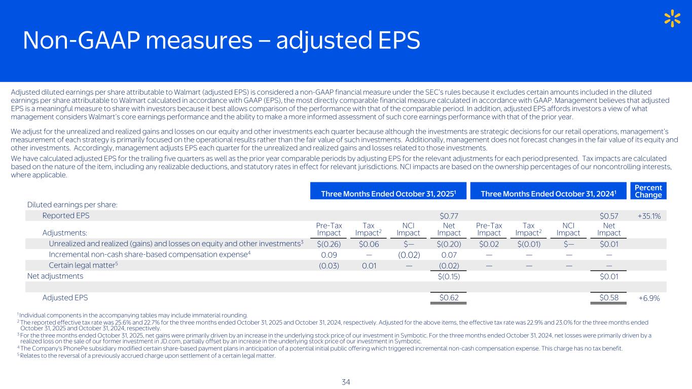 Non-GAAP measures – adjusted EPS Adjusted diluted earnings per share attributable to Walmart (adjusted EPS) is considered a non-GAAP financial measure under the SEC’s rules because it excludes certain amounts included in the diluted earnings per share attributable to Walmart calculated in accordance with GAAP (EPS), the most directly comparable financial measure calculated in accordance with GAAP. Management believes that adjusted EPS is a meaningful measure to share with investors because it best allows comparison of the performance with that of the comparable period. In addition, adjusted EPS affords investors a view of what management considers Walmart’s core earnings performance and the ability to make a more informed assessment of such core earnings performance with that of the prior year. We adjust for the unrealized and realized gains and losses on our equity and other investments each quarter because although the investments are strategic decisions for our retail operations, management’s measurement of each strategy is primarily focused on the operational results rather than the fair value of such investments. Additionally, management does not forecast changes in the fair value of its equity and other investments. Accordingly, management adjusts EPS each quarter for the unrealized and realized gains and losses related to those investments. We have calculated adjusted EPS for the trailing five quarters as well as the prior year comparable periods by adjusting EPS for the relevant adjustments for each period presented. Tax impacts are calculated based on the nature of the item, including any realizable deductions, and statutory rates in effect for relevant jurisdictions. NCI impacts are based on the ownership percentages of our noncontrolling interests, where applicable. Three Months Ended October 31, 20251 Three Months Ended October 31, 20241 Percent Change Diluted earnings per share: Reported EPS $0.77 $0.57 +35.1% Adjustments: Pre-Tax Impact Tax Impact2 NCI Impact Net Impact Pre-Tax Impact Tax Impact2 NCI Impact Net Impact Unrealized and realized (gains) and losses on equity and other investments3 $(0.26) $0.06 $— $(0.20) $0.02 $(0.01) $— $0.01 Incremental non-cash share-based compensation expense4 0.09 — (0.02) 0.07 — — — — Certain legal matter5 (0.03) 0.01 — (0.02) — — — — Net adjustments $(0.15) $0.01 Adjusted EPS $0.62 $0.58 +6.9% 1 Individual components in the accompanying tables may include immaterial rounding. 2 The reported effective tax rate was 25.6% and 22.7% for the three months ended October 31, 2025 and October 31, 2024, respectively. Adjusted for the above items, the effective tax rate was 22.9% and 23.0% for the three months ended October 31, 2025 and October 31, 2024, respectively. 3 For the three months ended October 31, 2025, net gains were primarily driven by an increase in the underlying stock price of our investment in Symbotic. For the three months ended October 31, 2024, net losses were primarily driven by a realized loss on the sale of our former investment in JD.com, partially offset by an increase in the underlying stock price of our investment in Symbotic. 4 The Company's PhonePe subsidiary modified certain share-based payment plans in anticipation of a potential initial public offering which triggered incremental non-cash compensation expense. This charge has no tax benefit. 5 Relates to the reversal of a previously accrued charge upon settlement of a certain legal matter. 34