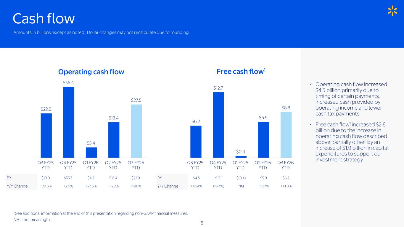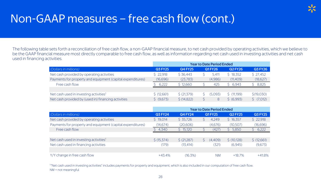 Non-GAAP measures – free cash flow We define free cash flow as net cash provided by operating activities in a period minus payments for property and equipment made in that period. Net cash provided by operating activities was $27.5 billion for the nine months ended October 31, 2025, which represents an increase of $4.5 billion when compared to the same period in the prior year. The increase was primarily due to timing of certain payments, increased cash provided by operating income and lower cash tax payments. Free cash flow for the nine months ended October 31, 2025 was $8.8 billion, which represents an increase of $2.6 billion when compared to the same period in the prior year. The increase in free cash flow was due to the increase in net cash provided by operating activities described above, partially offset by an increase of $1.9 billion in capital expenditures to support our investment strategy. Free cash flow is considered a non-GAAP financial measure. Management believes, however, that free cash flow, which measures our ability to generate additional cash from our business operations, is an important financial measure for use in evaluating the Company's financial performance. Free cash flow should be considered in addition to, rather than as a substitute for, consolidated net income as a measure of our performance and net cash provided by operating activities as a measure of our liquidity. Walmart’s definition of free cash flow is limited, in that it does not represent residual cash flows available for discretionary expenditures, due to the fact that the measure does not deduct the payments required for debt service and other contractual obligations or payments made for business acquisitions. Therefore, we believe it is important to view free cash flow as a measure that provides supplemental information to our Consolidated Statements of Cash Flows. Although other companies report their free cash flow, numerous methods may exist for calculating a company’s free cash flow. As a result, the method used by Walmart’s management to calculate our free cash flow may differ from the methods used by other companies to calculate their free cash flow. 27