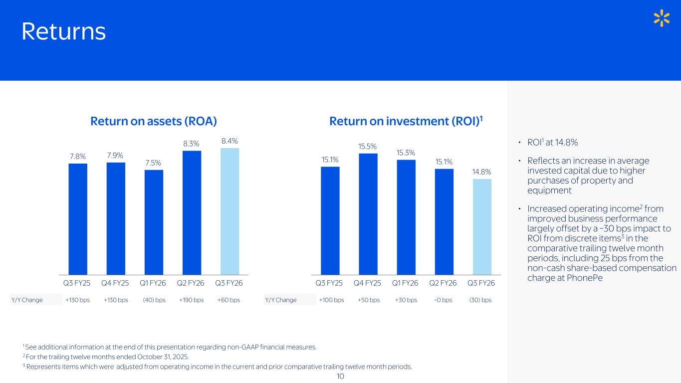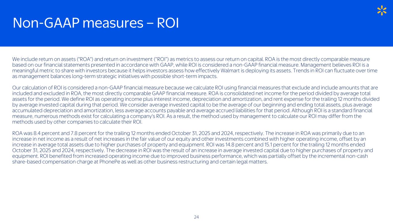 Non-GAAP measures – ROI We include return on assets ("ROA") and return on investment (“ROI”) as metrics to assess our return on capital. ROA is the most directly comparable measure based on our financial statements presented in accordance with GAAP, while ROI is considered a non-GAAP financial measure. Management believes ROI is a meaningful metric to share with investors because it helps investors assess how effectively Walmart is deploying its assets. Trends in ROI can fluctuate over time as management balances long-term strategic initiatives with possible short-term impacts. Our calculation of ROI is considered a non-GAAP financial measure because we calculate ROI using financial measures that exclude and include amounts that are included and excluded in ROA, the most directly comparable GAAP financial measure. ROA is consolidated net income for the period divided by average total assets for the period. We define ROI as operating income plus interest income, depreciation and amortization, and rent expense for the trailing 12 months divided by average invested capital during that period. We consider average invested capital to be the average of our beginning and ending total assets, plus average accumulated depreciation and amortization, less average accounts payable and average accrued liabilities for that period. Although ROI is a standard financial measure, numerous methods exist for calculating a company's ROI. As a result, the method used by management to calculate our ROI may differ from the methods used by other companies to calculate their ROI. ROA was 8.4 percent and 7.8 percent for the trailing 12 months ended October 31, 2025 and 2024, respectively. The increase in ROA was primarily due to an increase in net income as a result of net increases in the fair value of our equity and other investments combined with higher operating income, offset by an increase in average total assets due to higher purchases of property and equipment. ROI was 14.8 percent and 15.1 percent for the trailing 12 months ended October 31, 2025 and 2024, respectively. The decrease in ROI was the result of an increase in average invested capital due to higher purchases of property and equipment. ROI benefited from increased operating income due to improved business performance, which was partially offset by the incremental non-cash share-based compensation charge at PhonePe as well as other business restructuring and certain legal matters. 24
