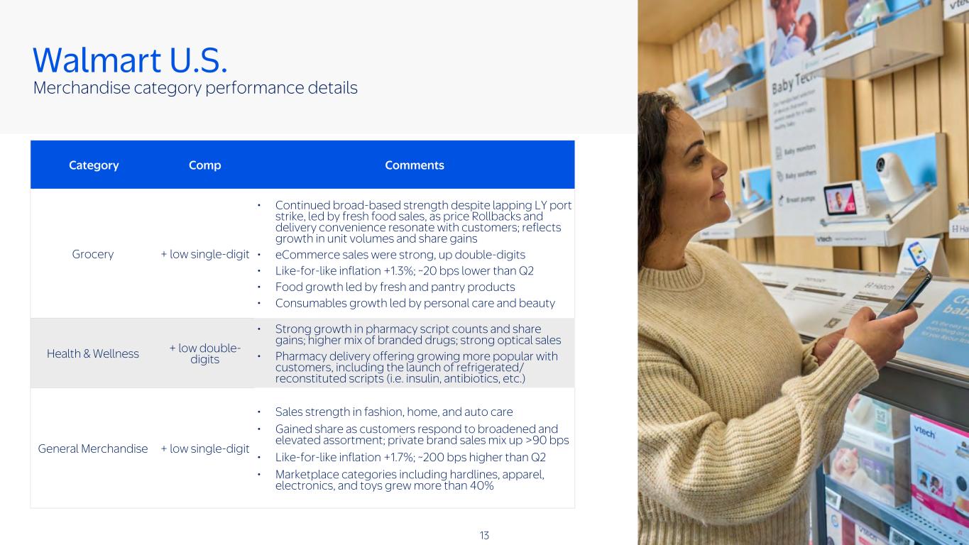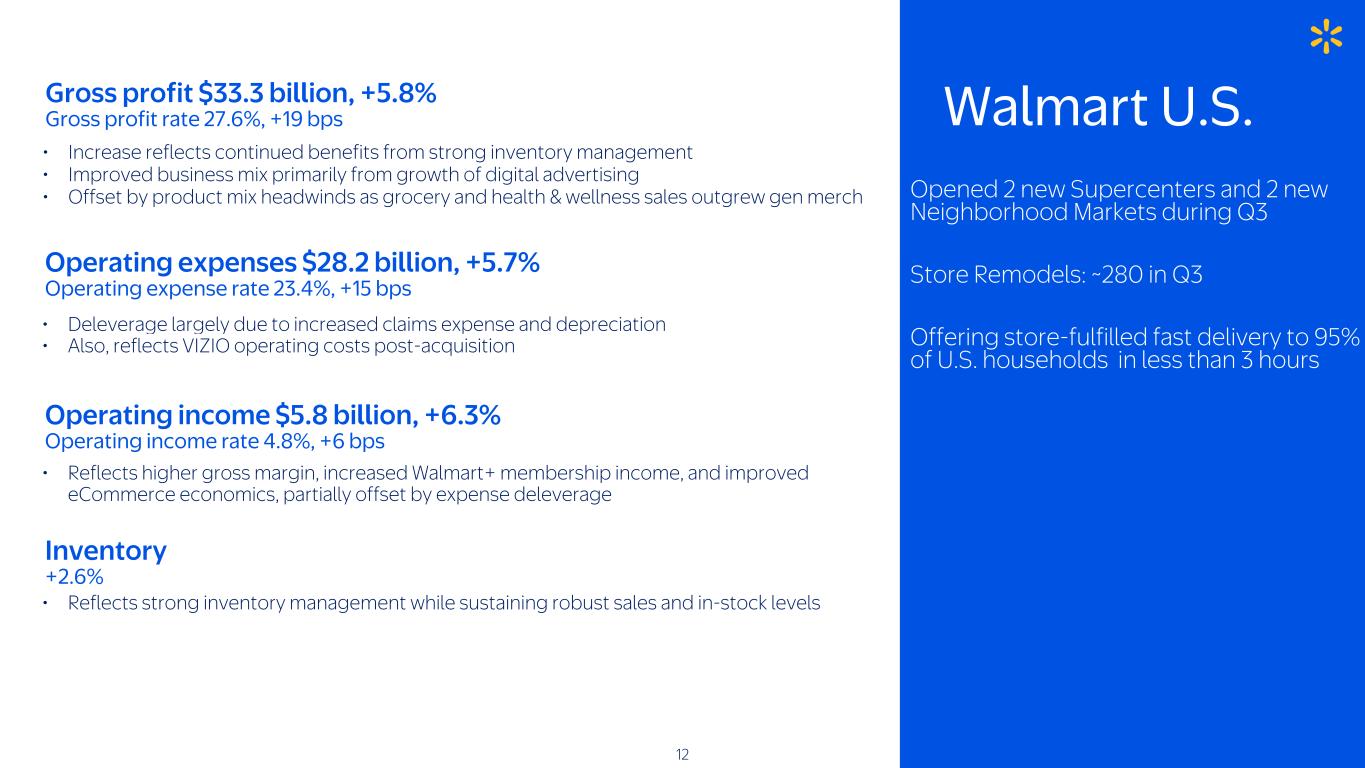 Opened 2 new Supercenters and 2 new Neighborhood Markets during Q3 Store Remodels: ~280 in Q3 Offering store-fulfilled fast delivery to 95% of U.S. households in less than 3 hours • Increase reflects continued benefits from strong inventory management • Improved business mix primarily from growth of digital advertising • Offset by product mix headwinds as grocery and health & wellness sales outgrew gen merch Gross profit $33.3 billion, +5.8% Gross profit rate 27.6%, +19 bps • Deleverage largely due to increased claims expense and depreciation • Also, reflects VIZIO operating costs post-acquisition Operating expenses $28.2 billion, +5.7% Operating expense rate 23.4%, +15 bps • Reflects higher gross margin, increased Walmart+ membership income, and improved eCommerce economics, partially offset by expense deleverage Operating income $5.8 billion, +6.3% Operating income rate 4.8%, +6 bps • Reflects strong inventory management while sustaining robust sales and in-stock levels Inventory +2.6% Walmart U.S. 12
