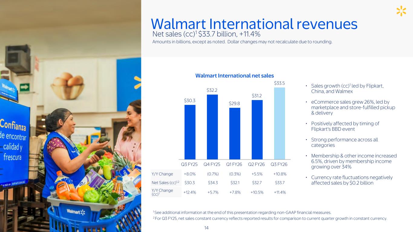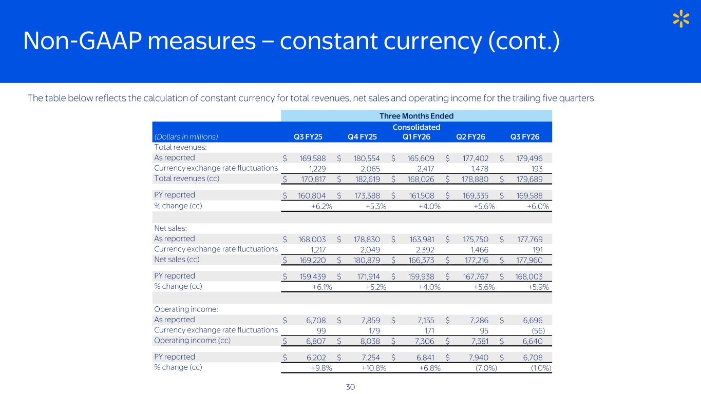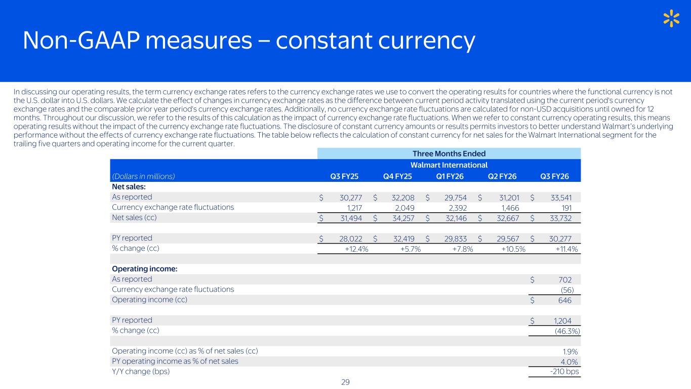 Non-GAAP measures – constant currency In discussing our operating results, the term currency exchange rates refers to the currency exchange rates we use to convert the operating results for countries where the functional currency is not the U.S. dollar into U.S. dollars. We calculate the effect of changes in currency exchange rates as the difference between current period activity translated using the current period's currency exchange rates and the comparable prior year period's currency exchange rates. Additionally, no currency exchange rate fluctuations are calculated for non-USD acquisitions until owned for 12 months. Throughout our discussion, we refer to the results of this calculation as the impact of currency exchange rate fluctuations. When we refer to constant currency operating results, this means operating results without the impact of the currency exchange rate fluctuations. The disclosure of constant currency amounts or results permits investors to better understand Walmart’s underlying performance without the effects of currency exchange rate fluctuations. The table below reflects the calculation of constant currency for net sales for the Walmart International segment for the trailing five quarters and operating income for the current quarter. Three Months Ended Walmart International (Dollars in millions) Q3 FY25 Q4 FY25 Q1 FY26 Q2 FY26 Q3 FY26 Net sales: As reported $ 30,277 $ 32,208 $ 29,754 $ 31,201 $ 33,541 Currency exchange rate fluctuations 1,217 2,049 2,392 1,466 191 Net sales (cc) $ 31,494 $ 34,257 $ 32,146 $ 32,667 $ 33,732 PY reported $ 28,022 $ 32,419 $ 29,833 $ 29,567 $ 30,277 % change (cc) +12.4% +5.7% +7.8% +10.5% +11.4% Operating income: As reported $ 702 Currency exchange rate fluctuations (56) Operating income (cc) $ 646 PY reported $ 1,204 % change (cc) (46.3%) Operating income (cc) as % of net sales (cc) 1.9% PY operating income as % of net sales 4.0% Y/Y change (bps) -210 bps 29 1Q4 FY24 reflects reported results for comparison to current quarter growth in constant currency.