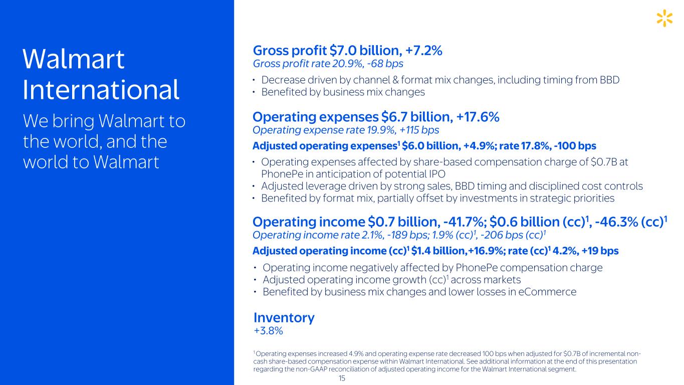 Non-GAAP measures – adjusted operating income (cont.) Three Months Ended Walmart International (Dollars in millions) Q3 FY26 Q3 FY25 Operating income $ 702 $ 1,204 Incremental non-cash share-based compensation expense1 722 — Adjusted operating income $ 1,424 $ 1,204 % change2 +18.3% NP Currency exchange rate fluctuations (17) — Adjusted operating income (cc) $ 1,407 $ 1,204 % change2 +16.9% NP The table below reflects the calculation of adjusted operating income for the three months ended October 31, 2025 and October 31, 2024 for the Walmart International segment. 1 The Company's PhonePe subsidiary modified certain share-based payment plans in anticipation of a potential initial public offering which triggered incremental non-cash compensation expense. This charge has no tax benefit. 2 Change versus prior year comparable period. NP = not provided 33