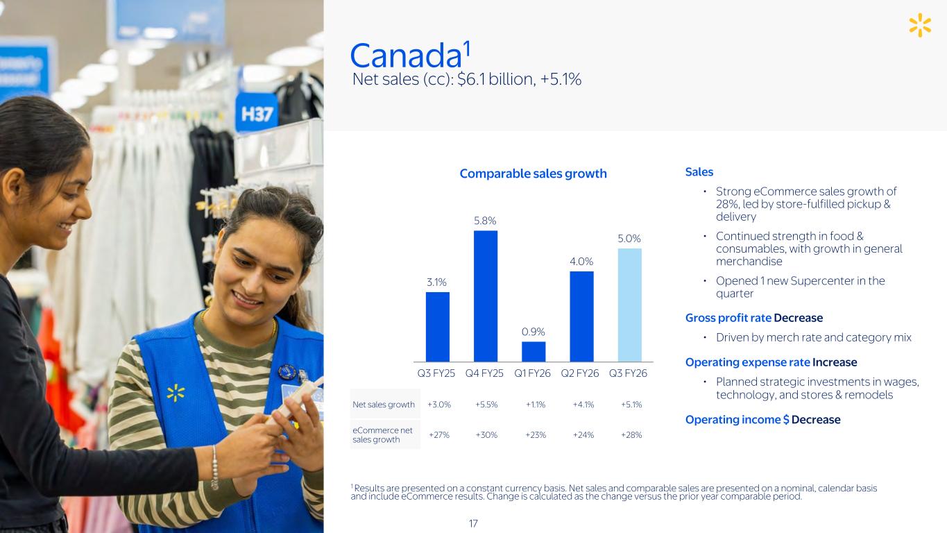 Net sales growth +5.9% +5.6% +3.0% +6.1% +5.1% eCommerce net sales growth +19% +20% +19% +21% +21% 1 Results are presented on a constant currency basis. Net sales and comparable sales are presented on a nominal, calendar basis and include eCommerce results. Change is calculated as the change versus the prior year comparable period. 2 Walmex includes the consolidated results of Mexico and Central America Walmex1,2 Net sales (cc): $12.7 billion, +5.1% 4.4% 4.1% 1.5% 4.4% 3.3% Q3 FY25 Q4 FY25 Q1 FY26 Q2 FY26 Q3 FY26 16 Comparable sales growth Sales • In Mexico, comp sales grew 3.9%, led by Supercenter and Sam’s Club • Double-digit eCommerce growth, driven by store-fulfilled pickup & delivery • Growth across all categories, led by food & consumables • Opened 175 new stores in the past 12 months, including 26 in the quarter Gross profit rate Decrease • Driven by price investments, partially offset by business mix changes Operating expense rate Increase • Investments in growth priorities, including wages, new stores, and technology Operating income $ Decrease