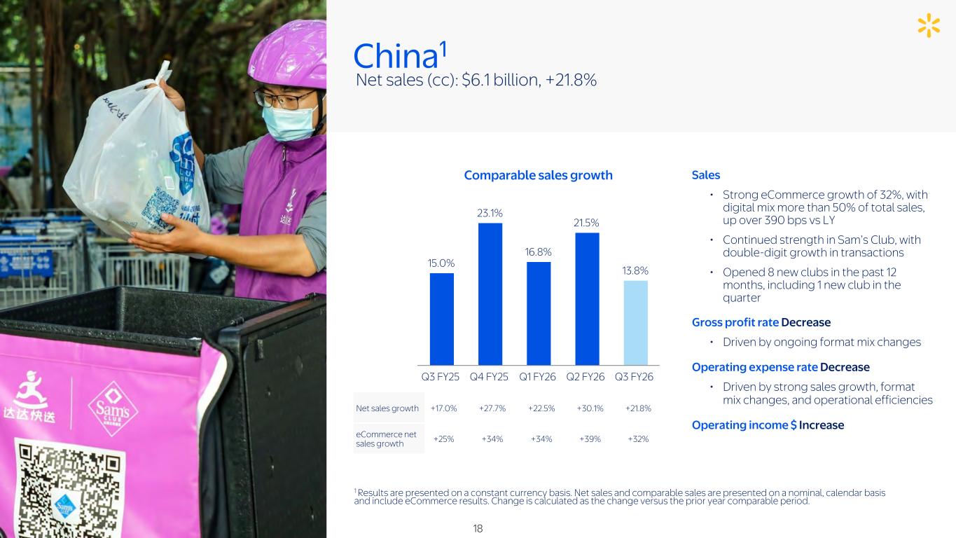 Sales • Strong eCommerce sales growth of 28%, led by store-fulfilled pickup & delivery • Continued strength in food & consumables, with growth in general merchandise • Opened 1 new Supercenter in the quarter Gross profit rate Decrease • Driven by merch rate and category mix Operating expense rate Increase • Planned strategic investments in wages, technology, and stores & remodels Operating income $ Decrease Net sales growth +3.0% +5.5% +1.1% +4.1% +5.1% eCommerce net sales growth +27% +30% +23% +24% +28% 1 Results are presented on a constant currency basis. Net sales and comparable sales are presented on a nominal, calendar basis and include eCommerce results. Change is calculated as the change versus the prior year comparable period. Canada1 Net sales (cc): $6.1 billion, +5.1% 3.1% 5.8% 0.9% 4.0% 5.0% Q3 FY25 Q4 FY25 Q1 FY26 Q2 FY26 Q3 FY26 17 Comparable sales growth