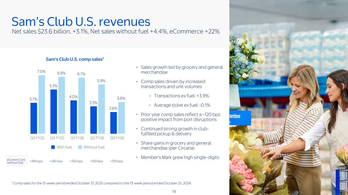 Sales • Strong eCommerce growth of 32%, with digital mix more than 50% of total sales, up over 390 bps vs LY • Continued strength in Sam’s Club, with double-digit growth in transactions • Opened 8 new clubs in the past 12 months, including 1 new club in the quarter Gross profit rate Decrease • Driven by ongoing format mix changes Operating expense rate Decrease • Driven by strong sales growth, format mix changes, and operational efficiencies Operating income $ Increase Net sales growth +17.0% +27.7% +22.5% +30.1% +21.8% eCommerce net sales growth +25% +34% +34% +39% +32% 1 Results are presented on a constant currency basis. Net sales and comparable sales are presented on a nominal, calendar basis and include eCommerce results. Change is calculated as the change versus the prior year comparable period. China1 Net sales (cc): $6.1 billion, +21.8% 15.0% 23.1% 16.8% 21.5% 13.8% Q3 FY25 Q4 FY25 Q1 FY26 Q2 FY26 Q3 FY26 18 Comparable sales growth