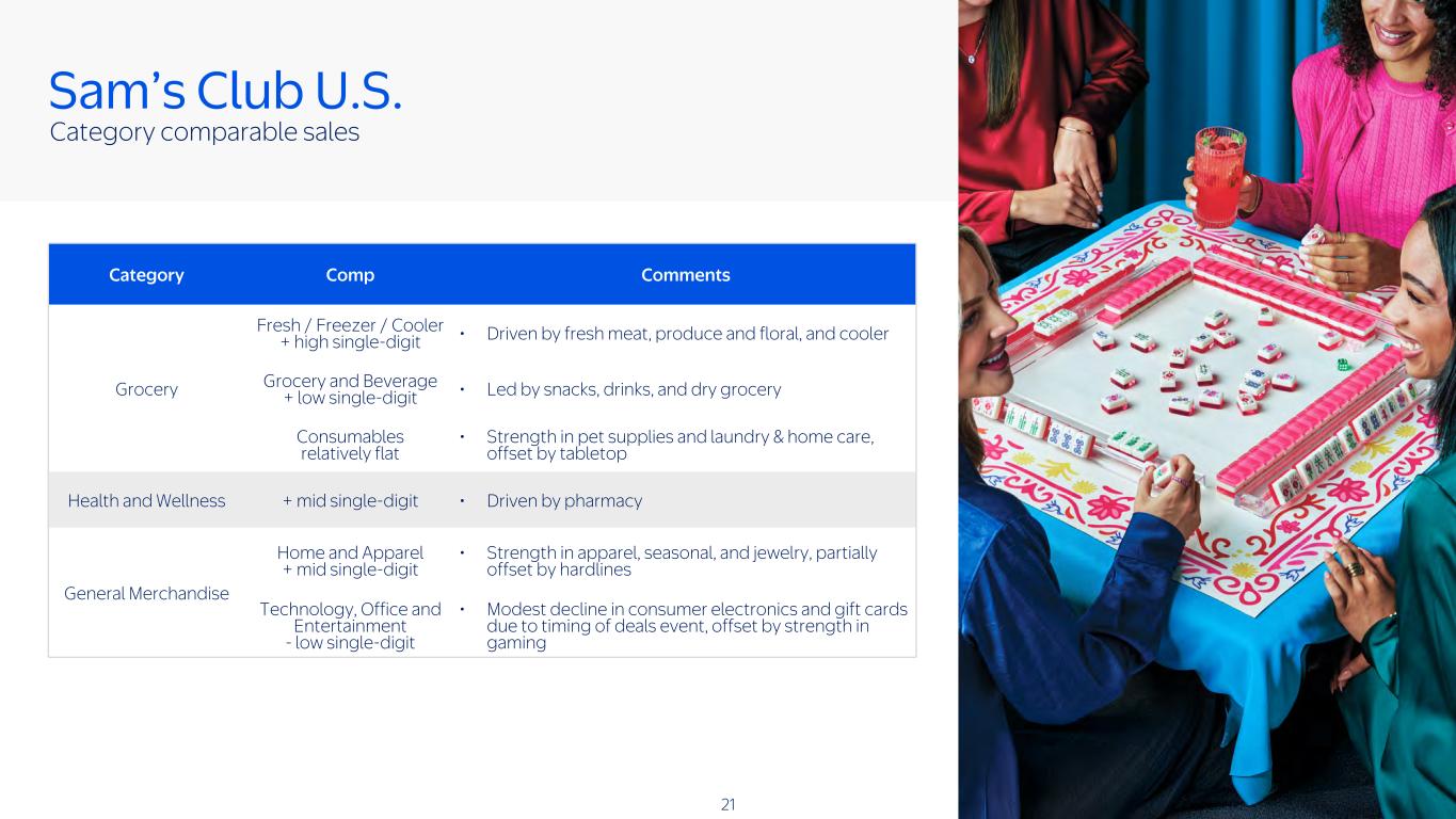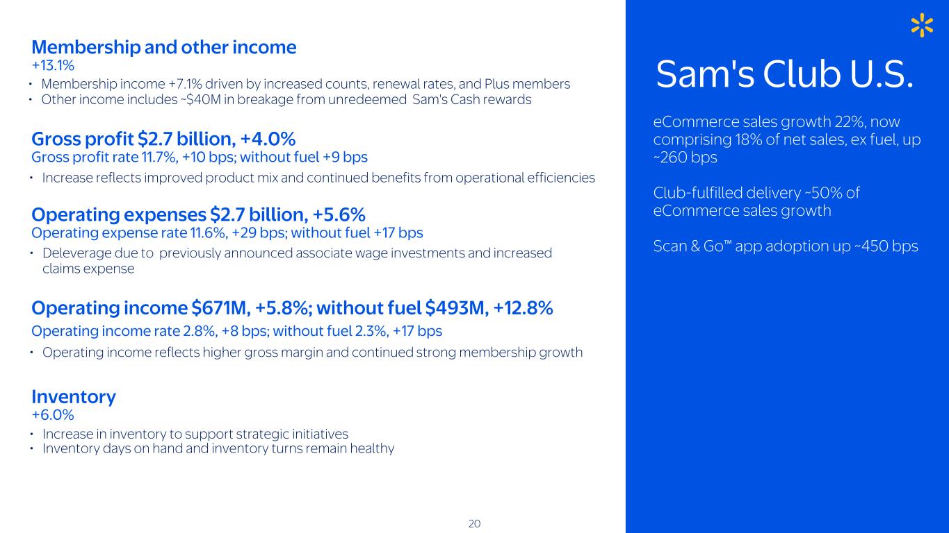 Net sales $23.6 billion, +3.1%, Net sales without fuel +4.4%, eCommerce +22% • Sales growth led by grocery and general merchandise • Comp sales driven by increased transactions and unit volumes ◦ Transactions ex fuel: +3.9% ◦ Average ticket ex fuel: -0.1% • Prior year comp sales reflect a ~120 bps positive impact from port disruptions • Continued strong growth in club- fulfilled pickup & delivery • Share gains in grocery and general merchandise (per Circana) • Member's Mark grew high single-digits eComm Cont. without fuel +290 bps +280 bps +350 bps +350 bps +330 bps 1 Comp sales for the 13-week period ended October 31, 2025 compared to the 13-week period ended October 25, 2024. Sam’s Club U.S. revenues 3.7% 5.3% 4.0% 3.3% 2.6% 7.0% 6.8% 6.7% 5.9% 3.8% With fuel Without fuel Q3 FY25 Q4 FY25 Q1 FY26 Q2 FY26 Q3 FY26 19 Sam's Club U.S. comp sales1