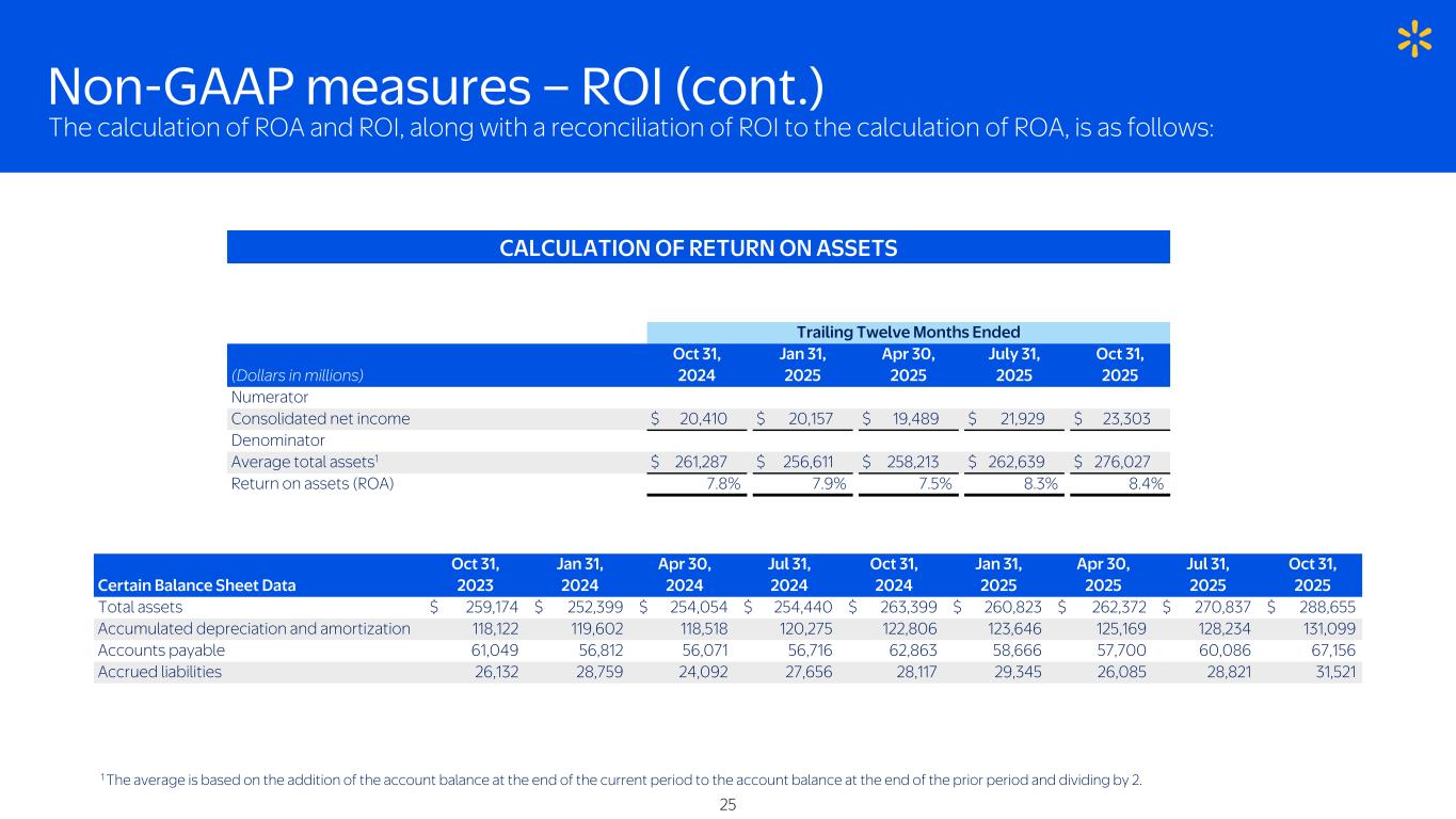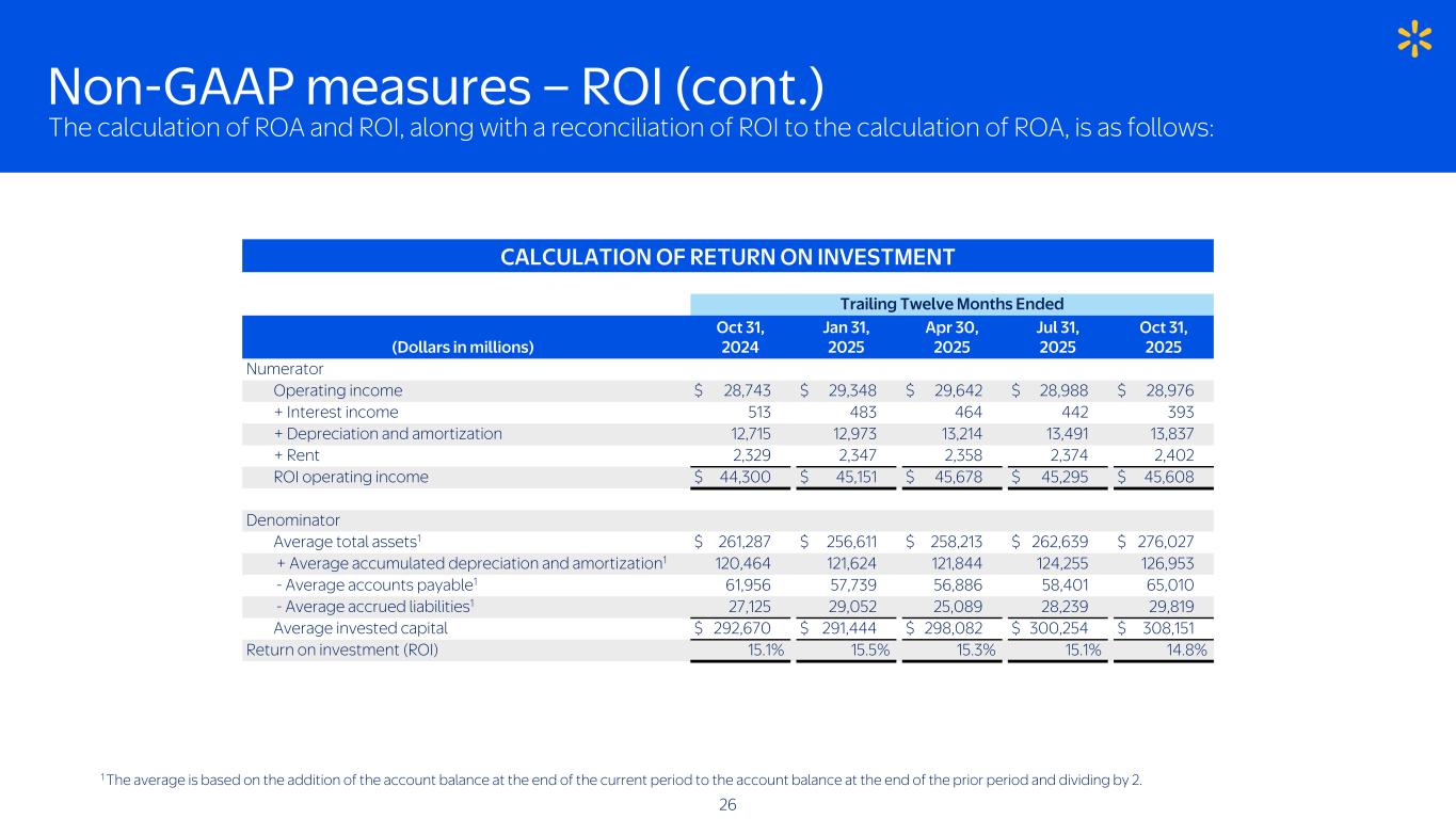 The calculation of ROA and ROI, along with a reconciliation of ROI to the calculation of ROA, is as follows: Non-GAAP measures – ROI (cont.) CALCULATION OF RETURN ON INVESTMENT Trailing Twelve Months Ended Oct 31, Jan 31, Apr 30, Jul 31, Oct 31, (Dollars in millions) 2024 2025 2025 2025 2025 Numerator Operating income $ 28,743 $ 29,348 $ 29,642 $ 28,988 $ 28,976 + Interest income 513 483 464 442 393 + Depreciation and amortization 12,715 12,973 13,214 13,491 13,837 + Rent 2,329 2,347 2,358 2,374 2,402 ROI operating income $ 44,300 $ 45,151 $ 45,678 $ 45,295 $ 45,608 Denominator Average total assets1 $ 261,287 $ 256,611 $ 258,213 $ 262,639 $ 276,027 '+ Average accumulated depreciation and amortization1 120,464 121,624 121,844 124,255 126,953 '- Average accounts payable1 61,956 57,739 56,886 58,401 65,010 '- Average accrued liabilities1 27,125 29,052 25,089 28,239 29,819 Average invested capital $ 292,670 $ 291,444 $ 298,082 $ 300,254 $ 308,151 Return on investment (ROI) 15.1% 15.5% 15.3% 15.1% 14.8% 1 The average is based on the addition of the account balance at the end of the current period to the account balance at the end of the prior period and dividing by 2. 26