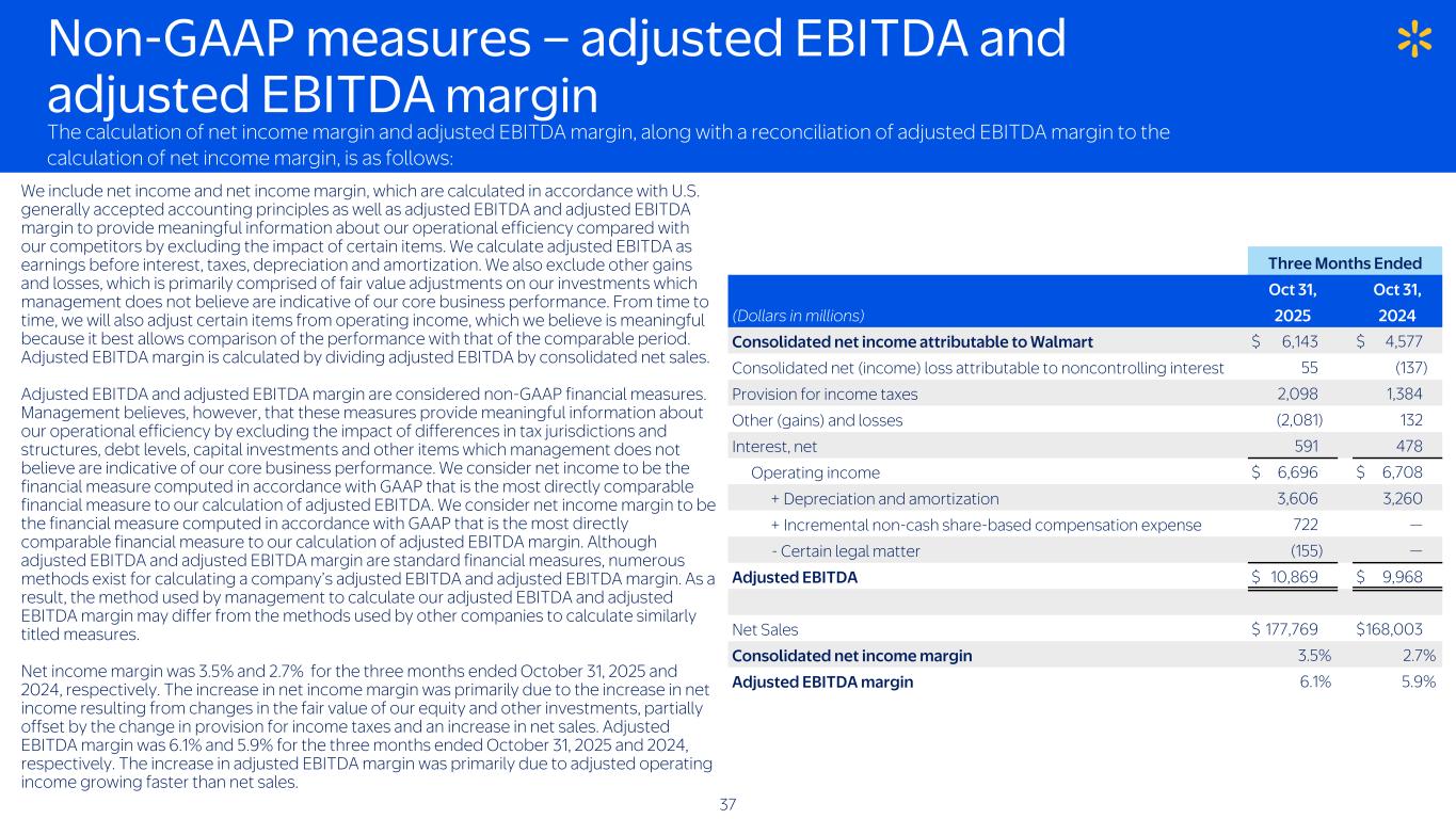 Non-GAAP measures – adjusted EBITDA and adjusted EBITDA margin The calculation of net income margin and adjusted EBITDA margin, along with a reconciliation of adjusted EBITDA margin to the calculation of net income margin, is as follows: Three Months Ended Oct 31, Oct 31, (Dollars in millions) 2025 2024 Consolidated net income attributable to Walmart $ 6,143 $ 4,577 Consolidated net (income) loss attributable to noncontrolling interest 55 (137) Provision for income taxes 2,098 1,384 Other (gains) and losses (2,081) 132 Interest, net 591 478 Operating income $ 6,696 $ 6,708 + Depreciation and amortization 3,606 3,260 + Incremental non-cash share-based compensation expense 722 — - Certain legal matter (155) — Adjusted EBITDA $ 10,869 $ 9,968 Net Sales $ 177,769 $ 168,003 Consolidated net income margin 3.5% 2.7% Adjusted EBITDA margin 6.1% 5.9% We include net income and net income margin, which are calculated in accordance with U.S. generally accepted accounting principles as well as adjusted EBITDA and adjusted EBITDA margin to provide meaningful information about our operational efficiency compared with our competitors by excluding the impact of certain items. We calculate adjusted EBITDA as earnings before interest, taxes, depreciation and amortization. We also exclude other gains and losses, which is primarily comprised of fair value adjustments on our investments which management does not believe are indicative of our core business performance. From time to time, we will also adjust certain items from operating income, which we believe is meaningful because it best allows comparison of the performance with that of the comparable period. Adjusted EBITDA margin is calculated by dividing adjusted EBITDA by consolidated net sales. Adjusted EBITDA and adjusted EBITDA margin are considered non-GAAP financial measures. Management believes, however, that these measures provide meaningful information about our operational efficiency by excluding the impact of differences in tax jurisdictions and structures, debt levels, capital investments and other items which management does not believe are indicative of our core business performance. We consider net income to be the financial measure computed in accordance with GAAP that is the most directly comparable financial measure to our calculation of adjusted EBITDA. We consider net income margin to be the financial measure computed in accordance with GAAP that is the most directly comparable financial measure to our calculation of adjusted EBITDA margin. Although adjusted EBITDA and adjusted EBITDA margin are standard financial measures, numerous methods exist for calculating a company’s adjusted EBITDA and adjusted EBITDA margin. As a result, the method used by management to calculate our adjusted EBITDA and adjusted EBITDA margin may differ from the methods used by other companies to calculate similarly titled measures. Net income margin was 3.5% and 2.7% for the three months ended October 31, 2025 and 2024, respectively. The increase in net income margin was primarily due to the increase in net income resulting from changes in the fair value of our equity and other investments, partially offset by the change in provision for income taxes and an increase in net sales. Adjusted EBITDA margin was 6.1% and 5.9% for the three months ended October 31, 2025 and 2024, respectively. The increase in adjusted EBITDA margin was primarily due to adjusted operating income growing faster than net sales. 37