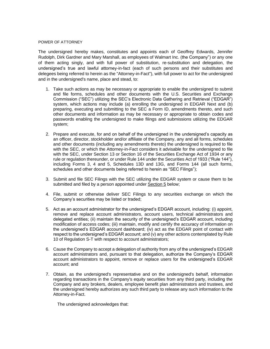 POWER OF ATTORNEY The undersigned hereby makes, constitutes and appoints each of Geoffrey Edwards, Jennifer Rudolph, Dirk Gardner and Mary Marshall, as employees of Walmart Inc. (the Company”) or any one of them acting singly, and with full power of substitution, re-substitution and delegation, the undersigned’s true and lawful attorney-in-fact (each of such persons and their substitutes and delegees being referred to herein as the "Attorney-in-Fact"), with full power to act for the undersigned and in the undersigned's name, place and stead, to: 1. Take such actions as may be necessary or appropriate to enable the undersigned to submit and file forms, schedules and other documents with the U.S. Securities and Exchange Commission (“SEC”) utilizing the SEC’s Electronic Data Gathering and Retrieval (“EDGAR”) system, which actions may include (a) enrolling the undersigned in EDGAR Next and (b) preparing, executing and submitting to the SEC a Form ID, amendments thereto, and such other documents and information as may be necessary or appropriate to obtain codes and passwords enabling the undersigned to make filings and submissions utilizing the EDGAR system; 2. Prepare and execute, for and on behalf of the undersigned in the undersigned’s capacity as an officer, director, stockholder and/or affiliate of the Company, any and all forms, schedules and other documents (including any amendments thereto) the undersigned is required to file with the SEC, or which the Attorney-in-Fact considers it advisable for the undersigned to file with the SEC, under Section 13 or Section 16 of the Securities Exchange Act of 1934 or any rule or regulation thereunder, or under Rule 144 under the Securities Act of 1933 (“Rule 144”), including Forms 3, 4 and 5, Schedules 13D and 13G, and Forms 144 (all such forms, schedules and other documents being referred to herein as “SEC Filings”); 3. Submit and file SEC Filings with the SEC utilizing the EDGAR system or cause them to be submitted and filed by a person appointed under Section 5 below; 4. File, submit or otherwise deliver SEC Filings to any securities exchange on which the Company’s securities may be listed or traded; 5. Act as an account administrator for the undersigned’s EDGAR account, including: (i) appoint, remove and replace account administrators, account users, technical administrators and delegated entities; (ii) maintain the security of the undersigned’s EDGAR account, including modification of access codes; (iii) maintain, modify and certify the accuracy of information on the undersigned’s EDGAR account dashboard; (iv) act as the EDGAR point of contact with respect to the undersigned’s EDGAR account; and (v) any other actions contemplated by Rule 10 of Regulation S-T with respect to account administrators; 6. Cause the Company to accept a delegation of authority from any of the undersigned’s EDGAR account administrators and, pursuant to that delegation, authorize the Company’s EDGAR account administrators to appoint, remove or replace users for the undersigned’s EDGAR account; and 7. Obtain, as the undersigned's representative and on the undersigned's behalf, information regarding transactions in the Company's equity securities from any third party, including the Company and any brokers, dealers, employee benefit plan administrators and trustees, and the undersigned hereby authorizes any such third party to release any such information to the Attorney-in-Fact. The undersigned acknowledges that: