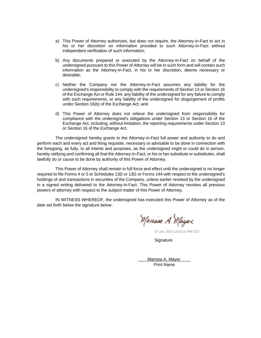 a) This Power of Attorney authorizes, but does not require, the Attorney-in-Fact to act in his or her discretion on information provided to such Attorney-in-Fact without independent verification of such information; b) Any documents prepared or executed by the Attorney-in-Fact on behalf of the undersigned pursuant to this Power of Attorney will be in such form and will contain such information as the Attorney-in-Fact, in his or her discretion, deems necessary or desirable; c) Neither the Company nor the Attorney-in-Fact assumes any liability for the undersigned's responsibility to comply with the requirements of Section 13 or Section 16 of the Exchange Act or Rule 144, any liability of the undersigned for any failure to comply with such requirements, or any liability of the undersigned for disgorgement of profits under Section 16(b) of the Exchange Act; and d) This Power of Attorney does not relieve the undersigned from responsibility for compliance with the undersigned's obligations under Section 13 or Section 16 of the Exchange Act, including, without limitation, the reporting requirements under Section 13 or Section 16 of the Exchange Act. The undersigned hereby grants to the Attorney-in-Fact full power and authority to do and perform each and every act and thing requisite, necessary or advisable to be done in connection with the foregoing, as fully, to all intents and purposes, as the undersigned might or could do in person, hereby ratifying and confirming all that the Attorney-in-Fact, or his or her substitute or substitutes, shall lawfully do or cause to be done by authority of this Power of Attorney. This Power of Attorney shall remain in full force and effect until the undersigned is no longer required to file Forms 4 or 5 or Schedules 13D or 13G or Forms 144 with respect to the undersigned's holdings of and transactions in securities of the Company, unless earlier revoked by the undersigned in a signed writing delivered to the Attorney-in-Fact. This Power of Attorney revokes all previous powers of attorney with respect to the subject matter of this Power of Attorney. IN WITNESS WHEREOF, the undersigned has executed this Power of Attorney as of the date set forth below the signature below. Signature Marissa A. Mayer Print Name 27 Jun, 2025 12:52:21 PM CDT