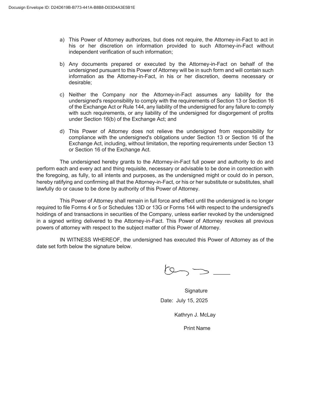 a) This Power of Attorney authorizes, but does not require, the Attorney-in-Fact to act in his or her discretion on information provided to such Attorney-in-Fact without independent verification of such information; b) Any documents prepared or executed by the Attorney-in-Fact on behalf of the undersigned pursuant to this Power of Attorney will be in such form and will contain such information as the Attorney-in-Fact, in his or her discretion, deems necessary or desirable; c) Neither the Company nor the Attorney-in-Fact assumes any liability for the undersigned's responsibility to comply with the requirements of Section 13 or Section 16 of the Exchange Act or Rule 144, any liability of the undersigned for any failure to comply with such requirements, or any liability of the undersigned for disgorgement of profits under Section 16(b) of the Exchange Act; and d) This Power of Attorney does not relieve the undersigned from responsibility for compliance with the undersigned's obligations under Section 13 or Section 16 of the Exchange Act, including, without limitation, the reporting requirements under Section 13 or Section 16 of the Exchange Act. The undersigned hereby grants to the Attorney-in-Fact full power and authority to do and perform each and every act and thing requisite, necessary or advisable to be done in connection with the foregoing, as fully, to all intents and purposes, as the undersigned might or could do in person, hereby ratifying and confirming all that the Attorney-in-Fact, or his or her substitute or substitutes, shall lawfully do or cause to be done by authority of this Power of Attorney. This Power of Attorney shall remain in full force and effect until the undersigned is no longer required to file Forms 4 or 5 or Schedules 13D or 13G or Forms 144 with respect to the undersigned's holdings of and transactions in securities of the Company, unless earlier revoked by the undersigned in a signed writing delivered to the Attorney-in-Fact. This Power of Attorney revokes all previous powers of attorney with respect to the subject matter of this Power of Attorney. IN WITNESS WHEREOF, the undersigned has executed this Power of Attorney as of the date set forth below the signature below. Signature Kathryn J. McLay Print Name Date: July 15, 2025