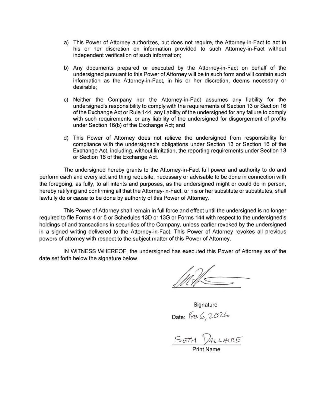a) This Power of Attorney authorizes, but does not require, the Attorney-in-Fact to act in his or her discretion on information provided to such Attorney-in-Fact without independent verification of such information; b) Any documents prepared or executed by the Attorney-in-Fact on behalf of the undersigned pursuant to this Power of Attorney will be in such form and will contain such information as the Attorney-in-Fact, in his or her discretion, deems necessary or desirable; c) Neither the Company nor the Attorney-in-Fact assumes any liability for the undersigned's responsibility to comply with the requirements of Section 13 or Section 16 of the Exchange Act or Rule 144, any liability of the undersigned for any failure to comply with such requirements, or any liability of the undersigned for disgorgement of profits under Section 16(b) of the Exchange Act; and d) This Power of Attorney does not relieve the undersigned from responsibil ity for compliance with the undersigned's obligations under Section 13 or Section 16 of the Exchange Act, including, without limitation, the reporting requirements under Section 13 or Section 16 of the Exchange Act. The undersigned hereby grants to the Attorney-in-Fact full power and authority to do and perform each and every act and thing requisite, necessary or advisable to be done in connection with the foregoing, as fully, to all intents and purposes, as the undersigned might or could do in person, hereby ratifying and confirming all that the Attorney-in-Fact, or his or her substitute or substitutes, shall lawfully do or cause to be done by authority of this Power of Attorney. This Power of Attorney shall remain in full force and effect until the undersigned is no longer required to file Forms 4 or 5 or Schedules 13D or 13G or Forms 144 with respect to the undersigned's holdings of and transactions in securities of the Company, unless earlier revoked by the undersigned in a signed writing delivered to the Attorney-in-Fact. This Power of Attorney revokes all previous powers of attorney with respect to the subject matter of this Power of Attorney. IN WITNESS WHEREOF, the undersigned has executed this Power of Attorney as of the date set forth below the signature below. Signature Date: fc.13 {:, z o'2.i:::, I s en--t 1/4-L '-It< \lb Print Name